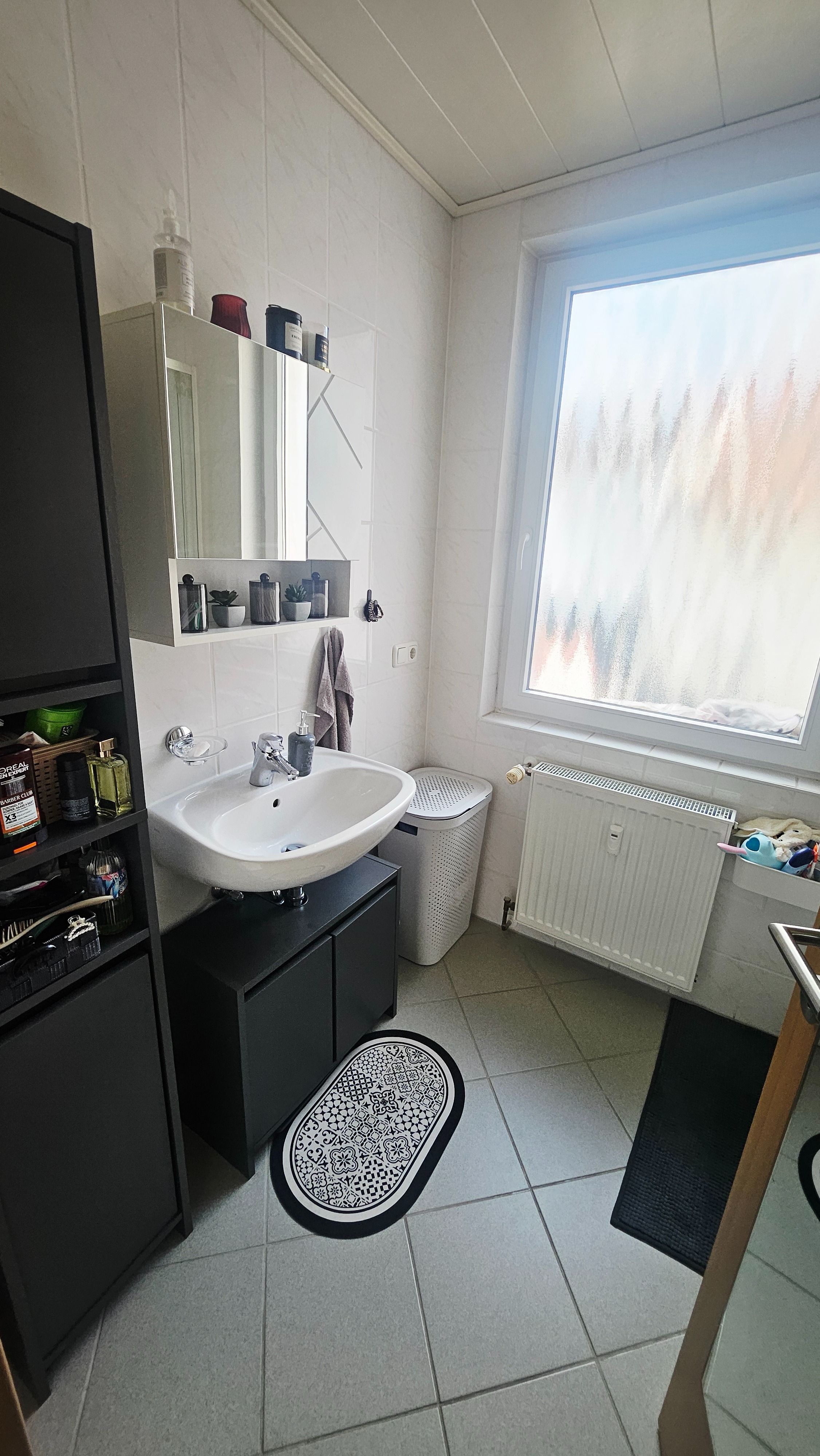 Das Tageslichtbad mit Dusche sorgt für eine angenehme Atmosphäre und bietet eine komfortable Möglichkeit zur kurzen Erfrischung im Alltag. Ergänzend steht ein separates WC zur Verfügung.