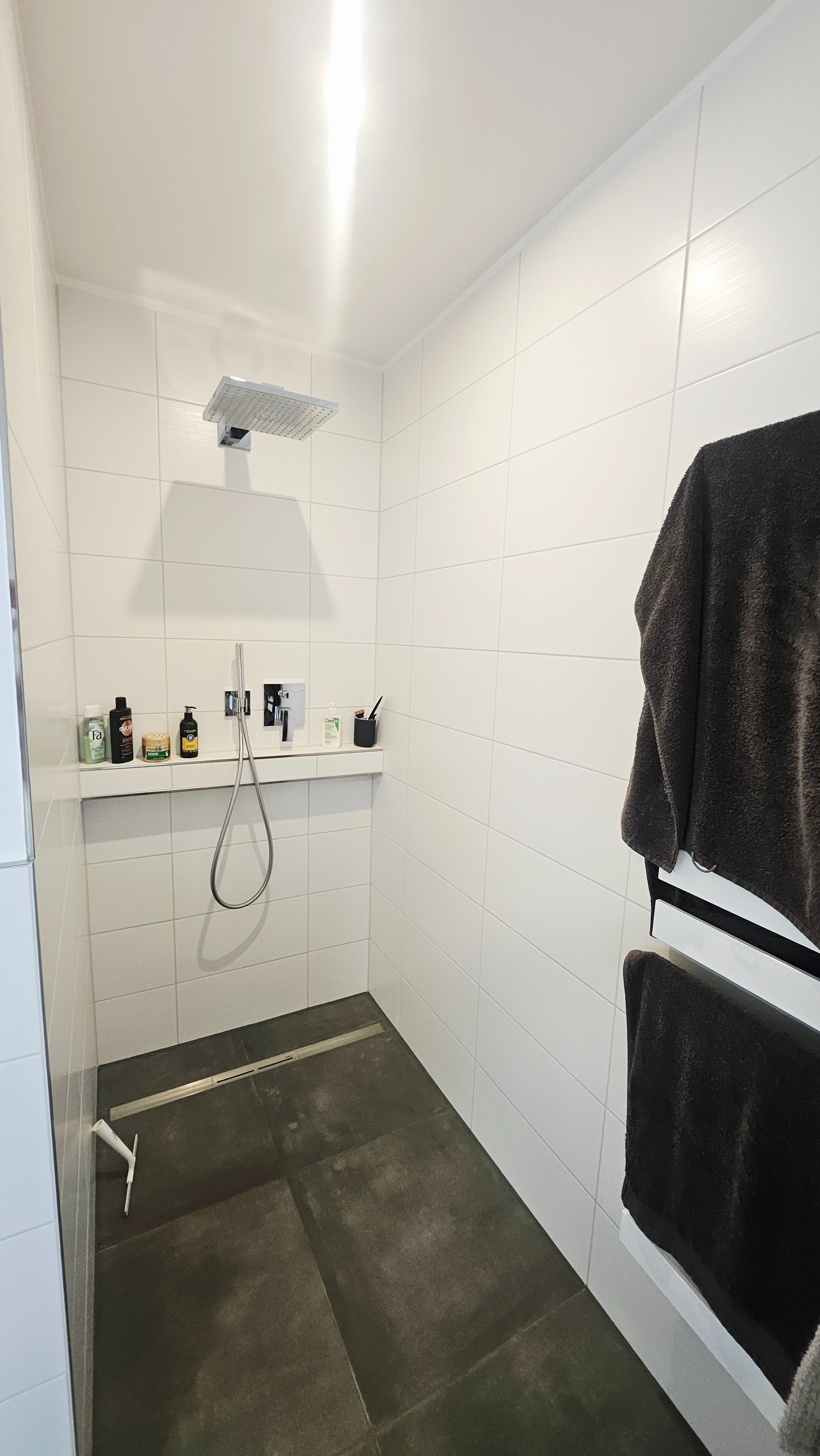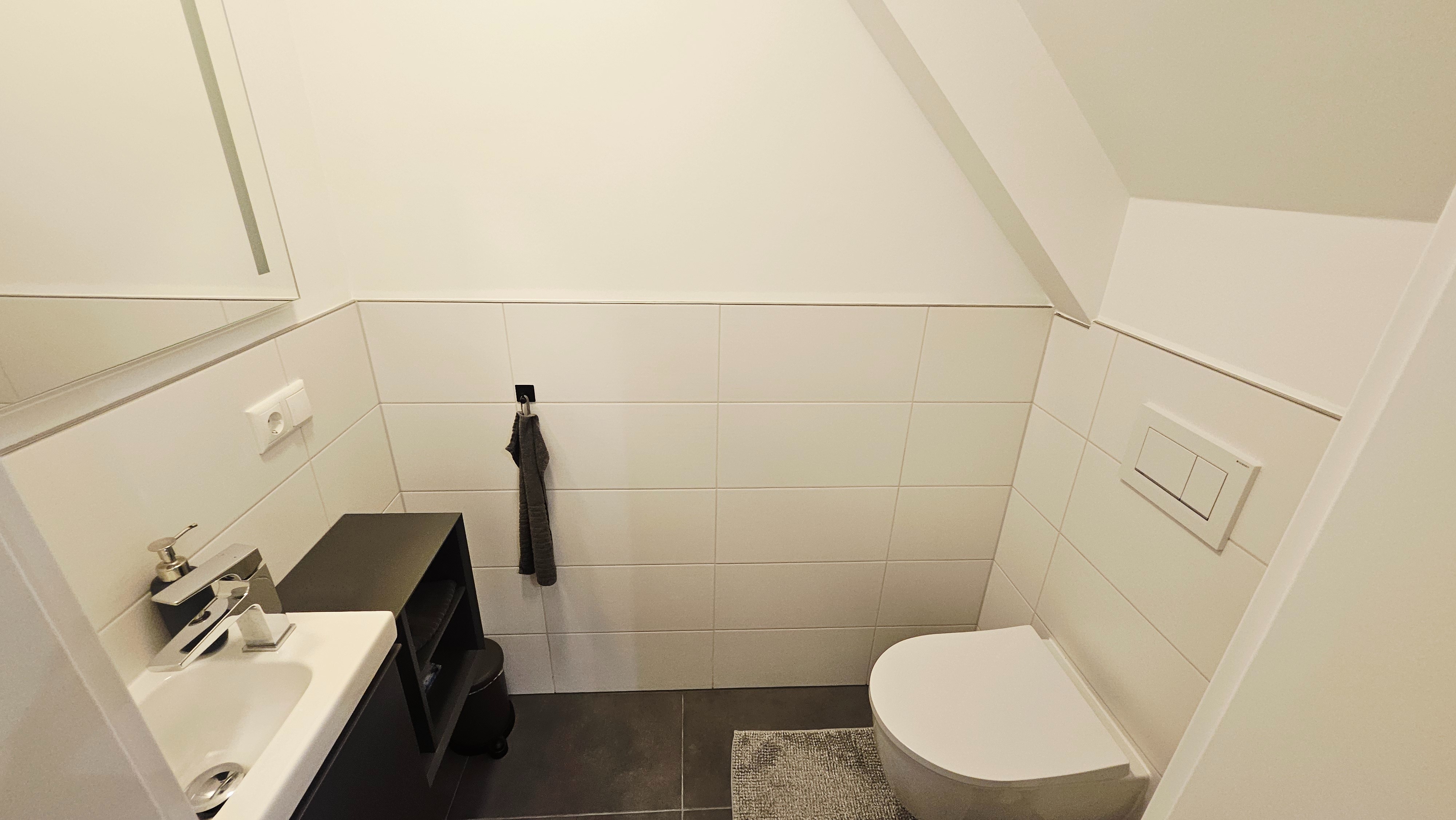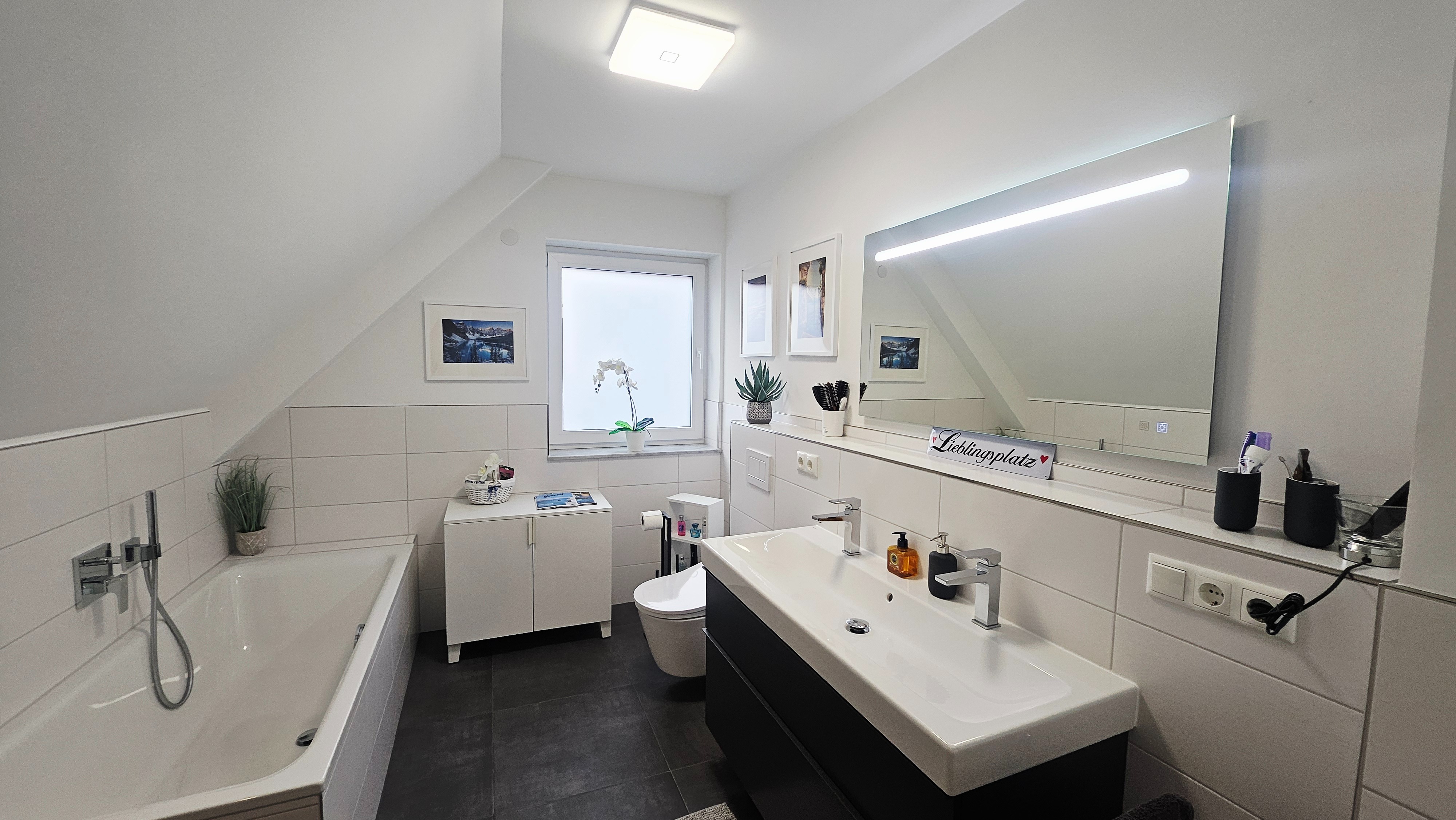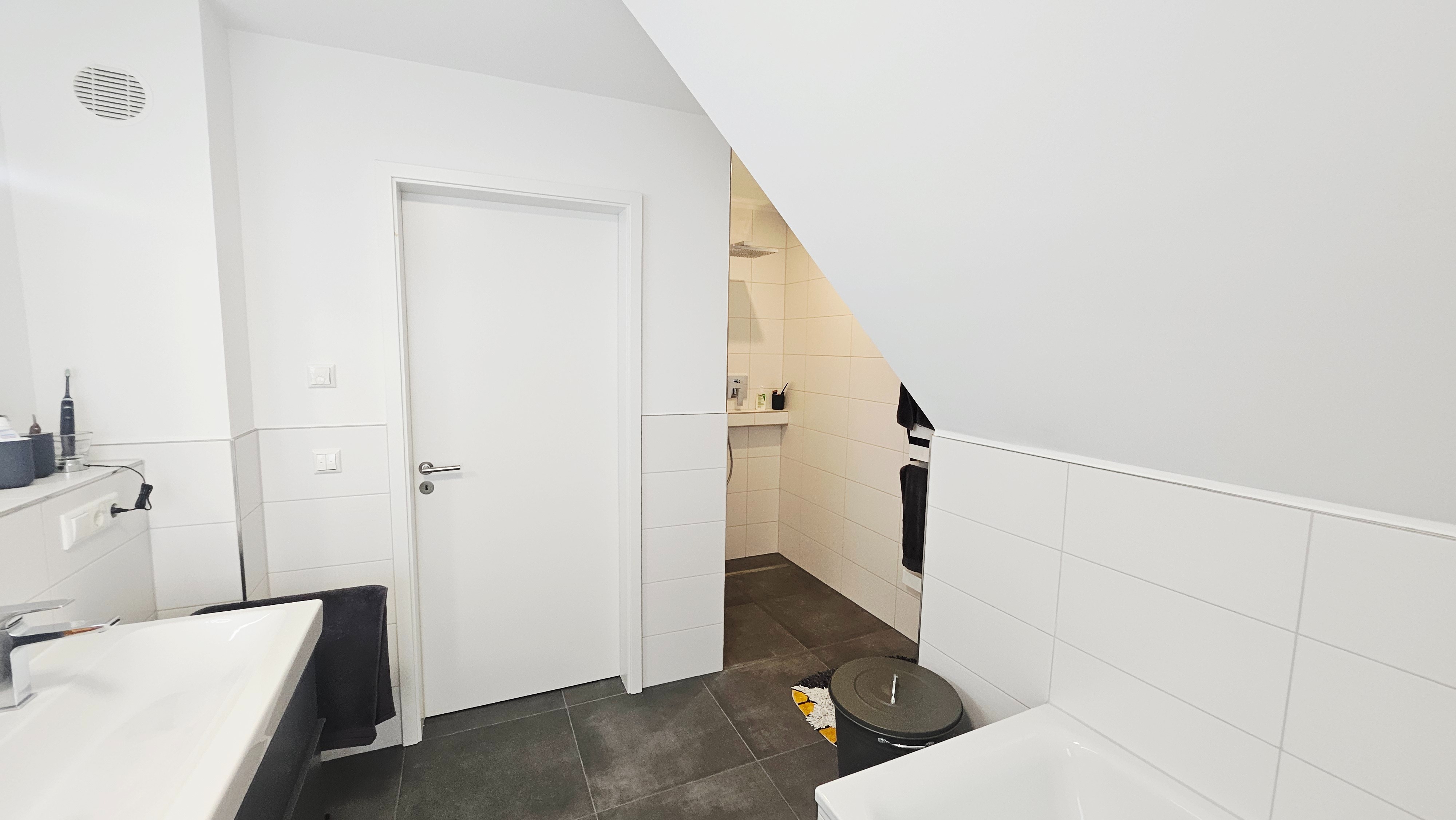 Das großzügige Tageslichtbad ist ein echtes Highlight: bodentiefe Dusche, Badewanne sowie hochwertige Badmöbel schaffen eine elegante Wohlfühloase. Ein separates Gäste-WC ergänzt die Ausstattung.