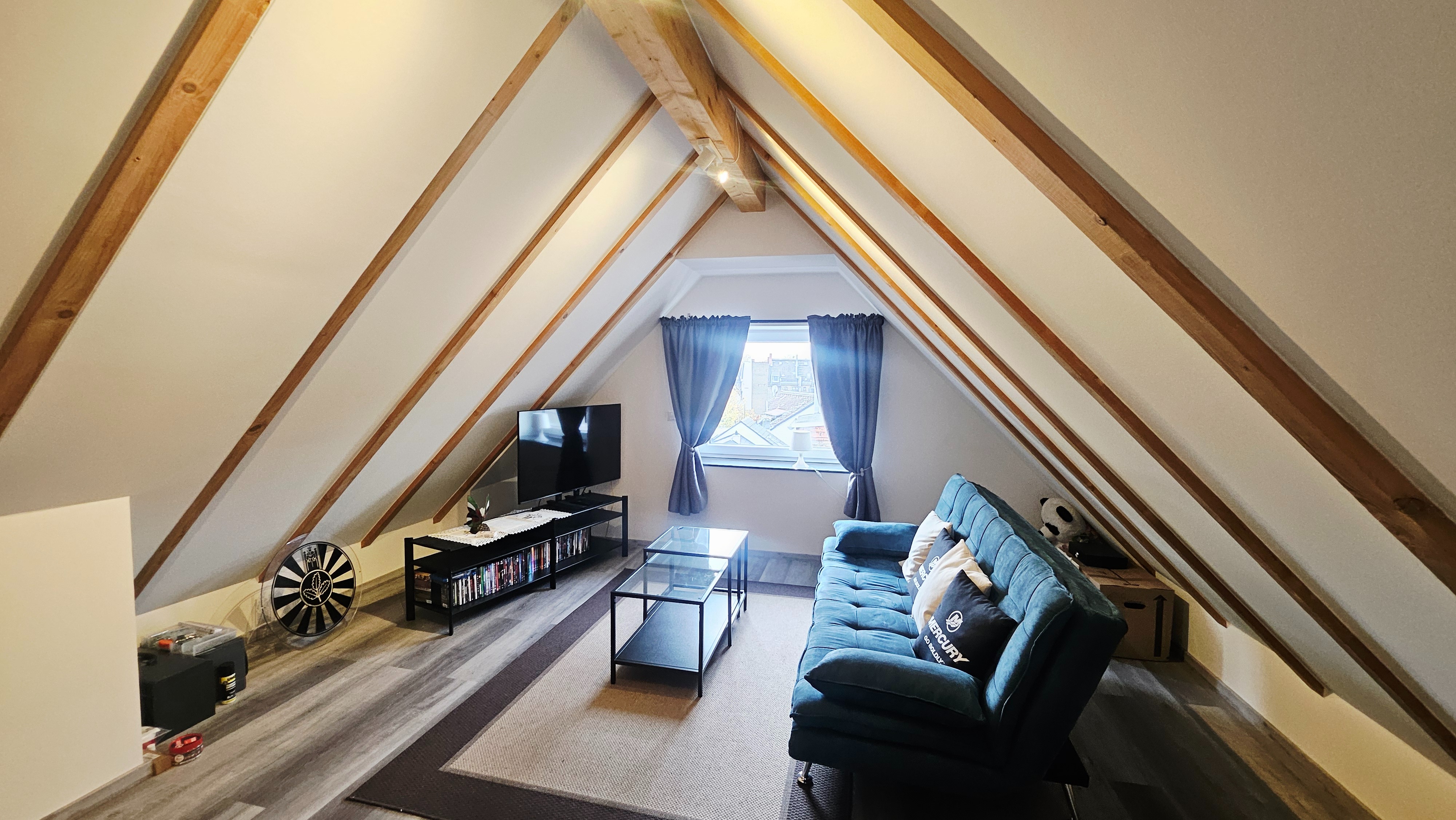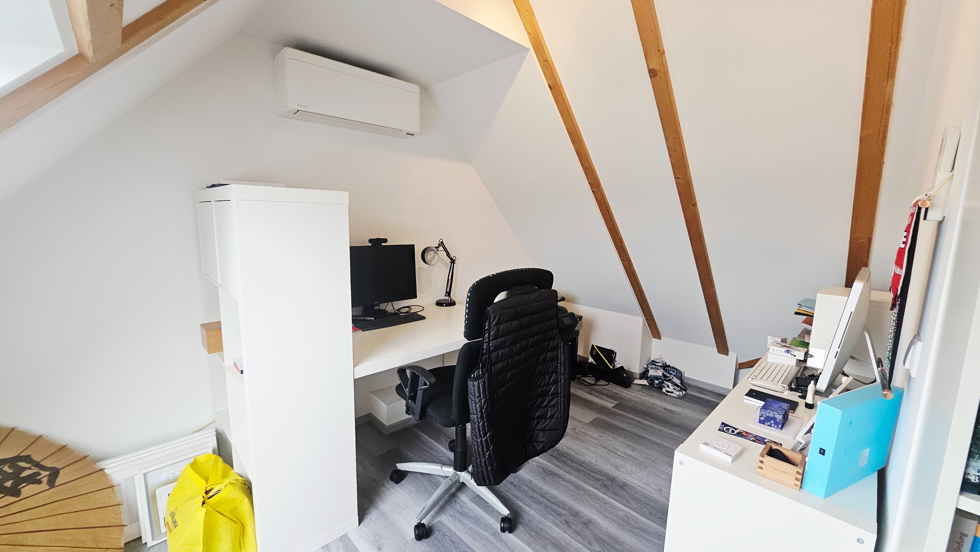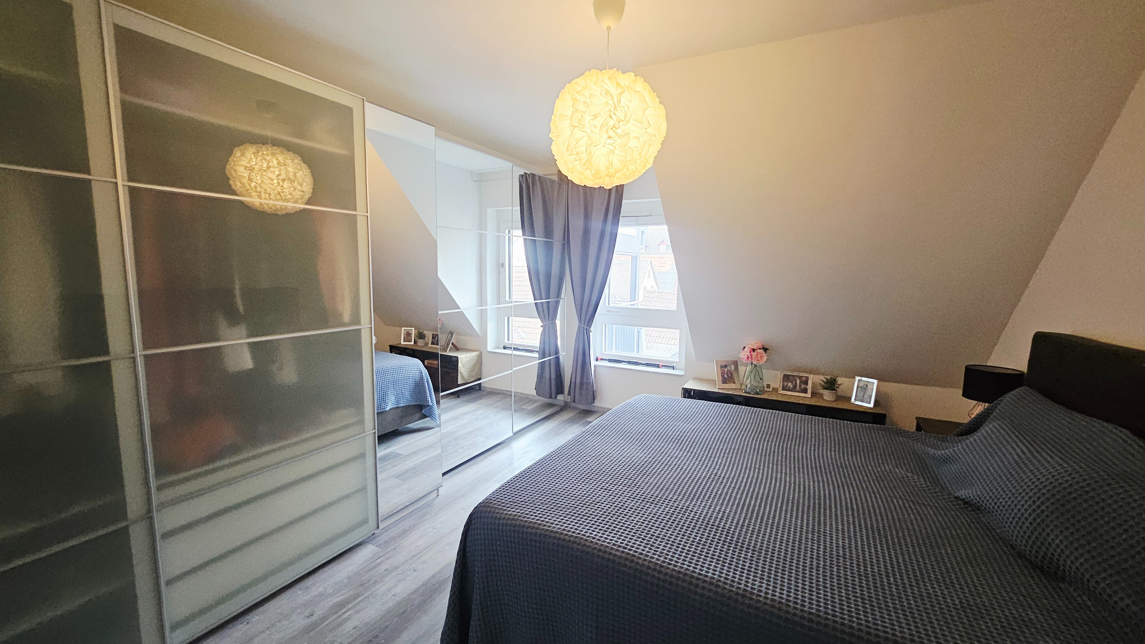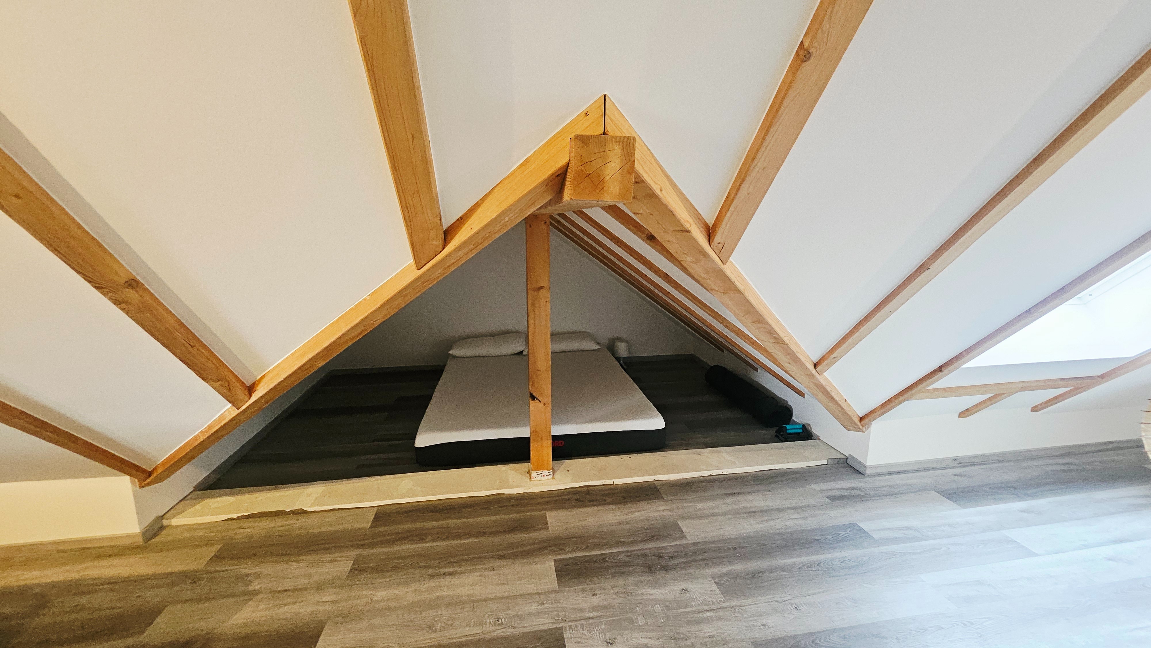 Der Schlafbereich im unteren Geschoss verfügt über eine praktische, angeschlossene Ankleide. Im ausgebauten Spitzboden steht Ihnen ein weiterer Raum zur Verfügung – perfekt als Arbeitszimmer, Gästezimmer oder zusätzliches Schlafzimmer.