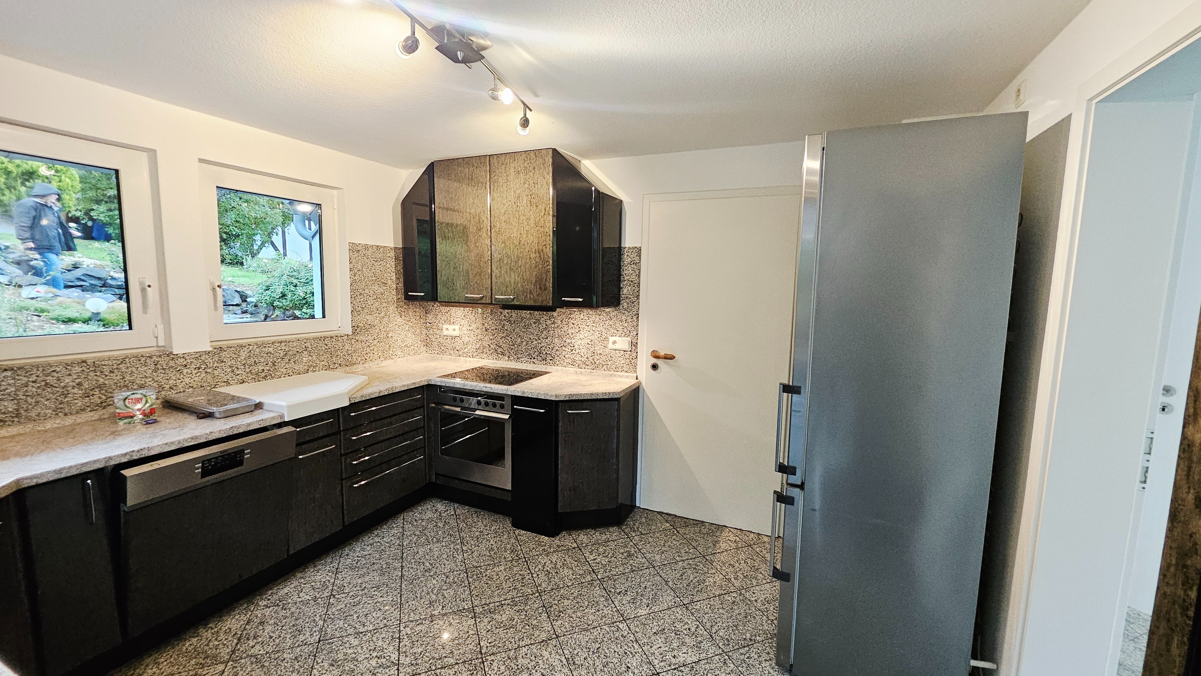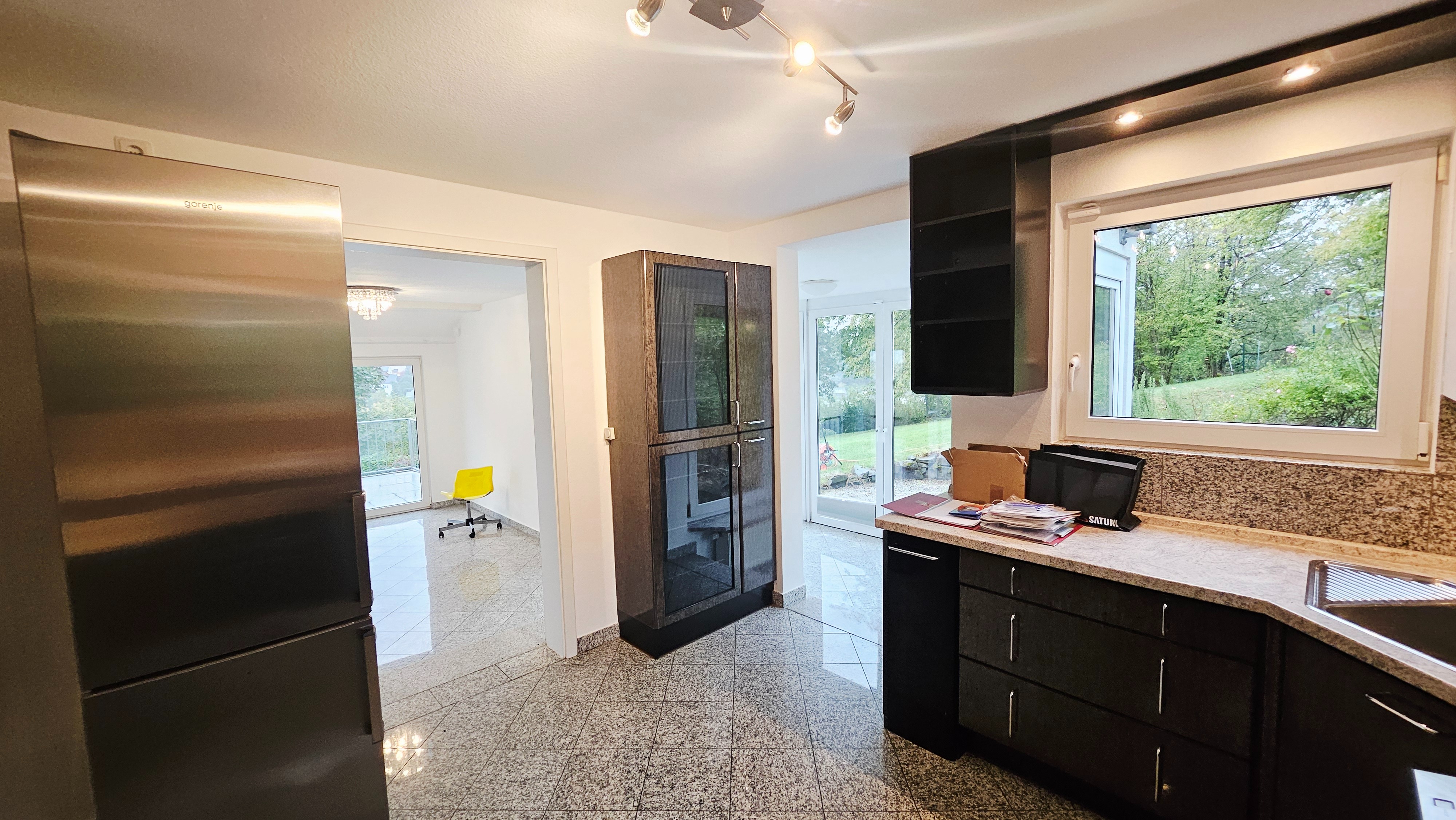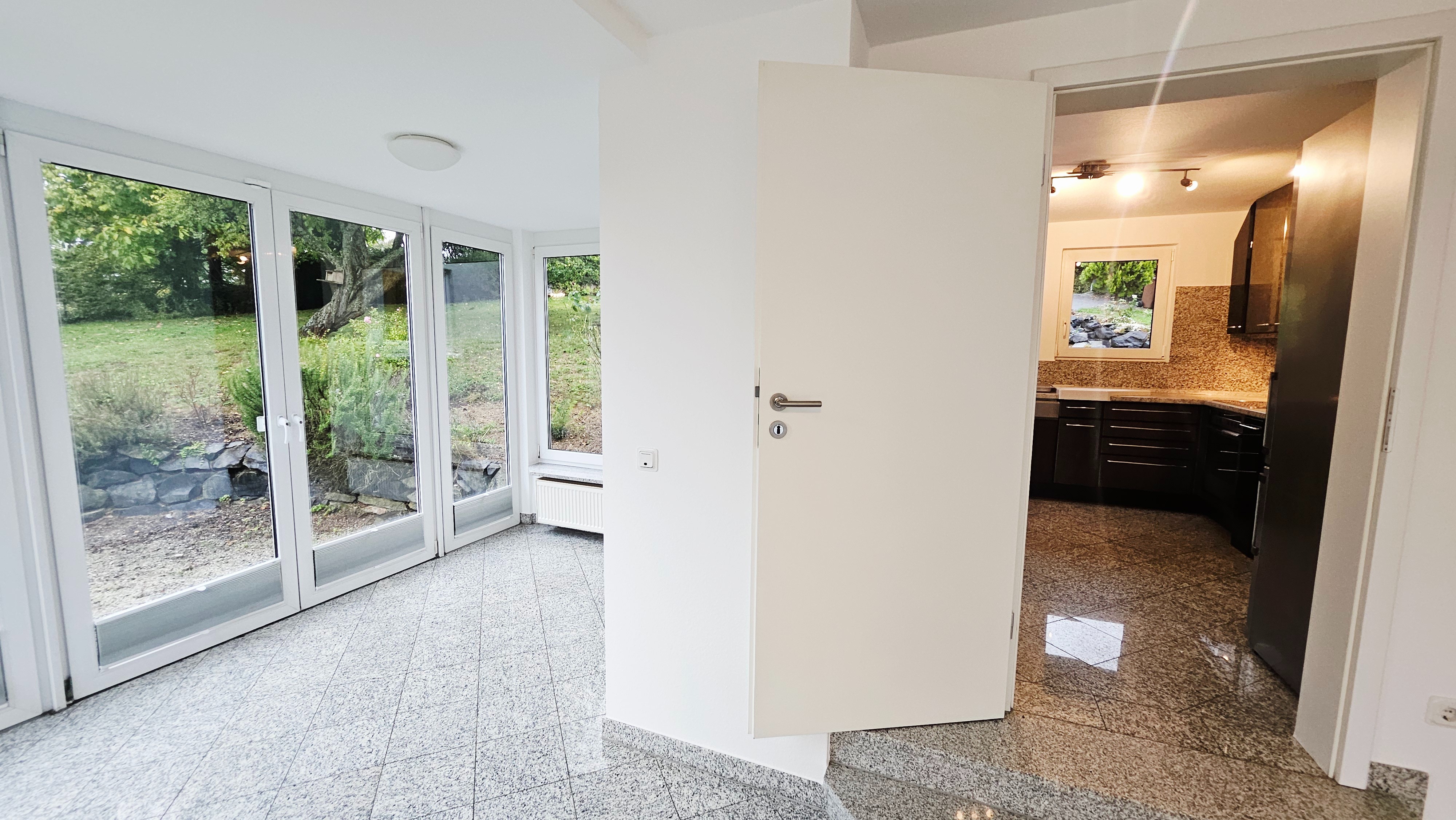 Die Küche ist als separater Raum angelegt und bietet dank ihrer Größe und des praktischen Zuschnitts viel Arbeitsfläche und Stauraum. Hier finden Sie eine moderne, gut ausgestattete Einbauküche, die durch den Eigentümer zur Verfügung gestellt wird. Direkt nebenan befindet sich ein zweiter Wintergarten mit Zugang zu einer weiteren Terrasse – ein heller, einladender Bereich, der sich wunderbar als Frühstücksplatz oder zusätzlicher Essbereich eignet.