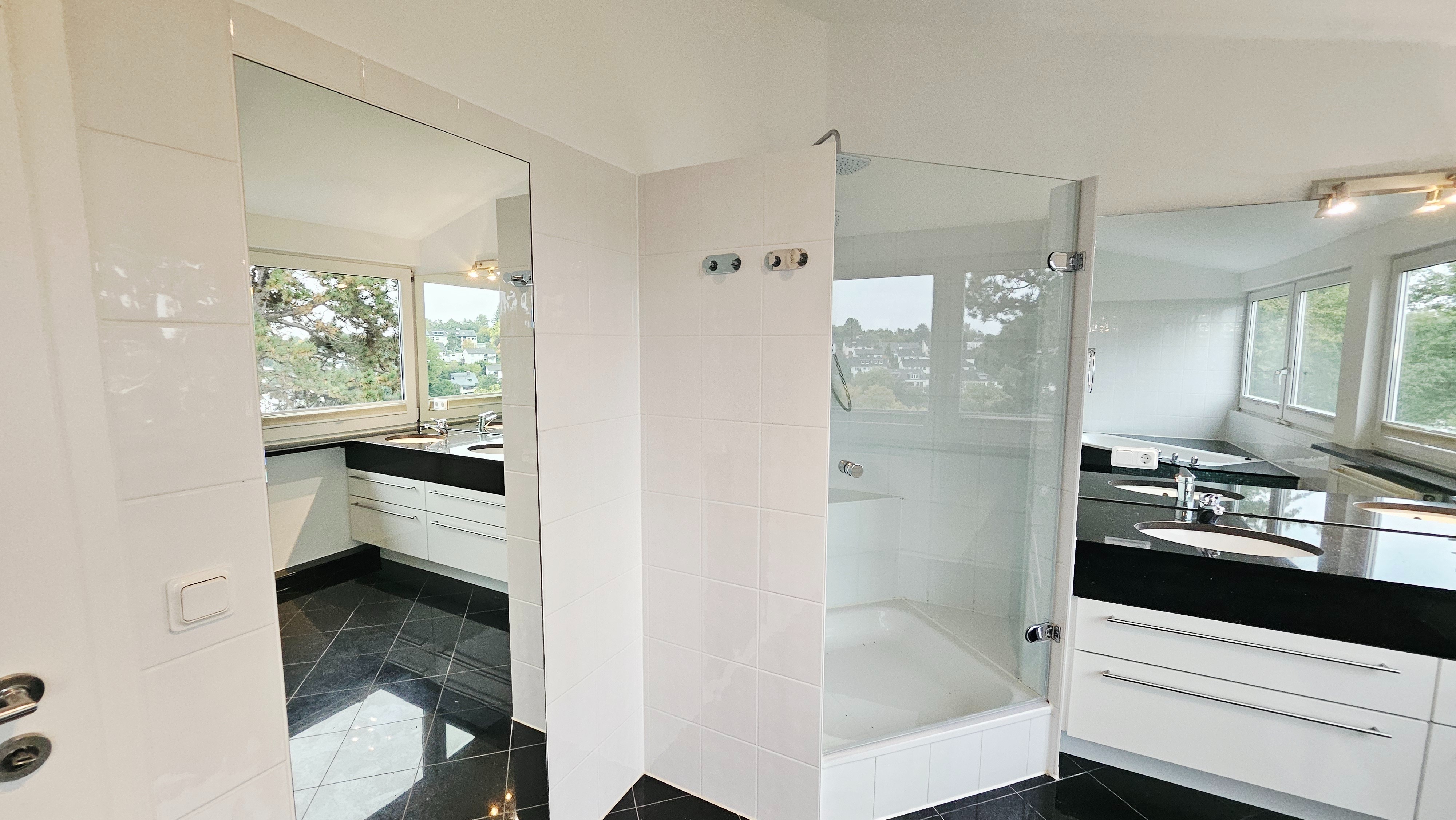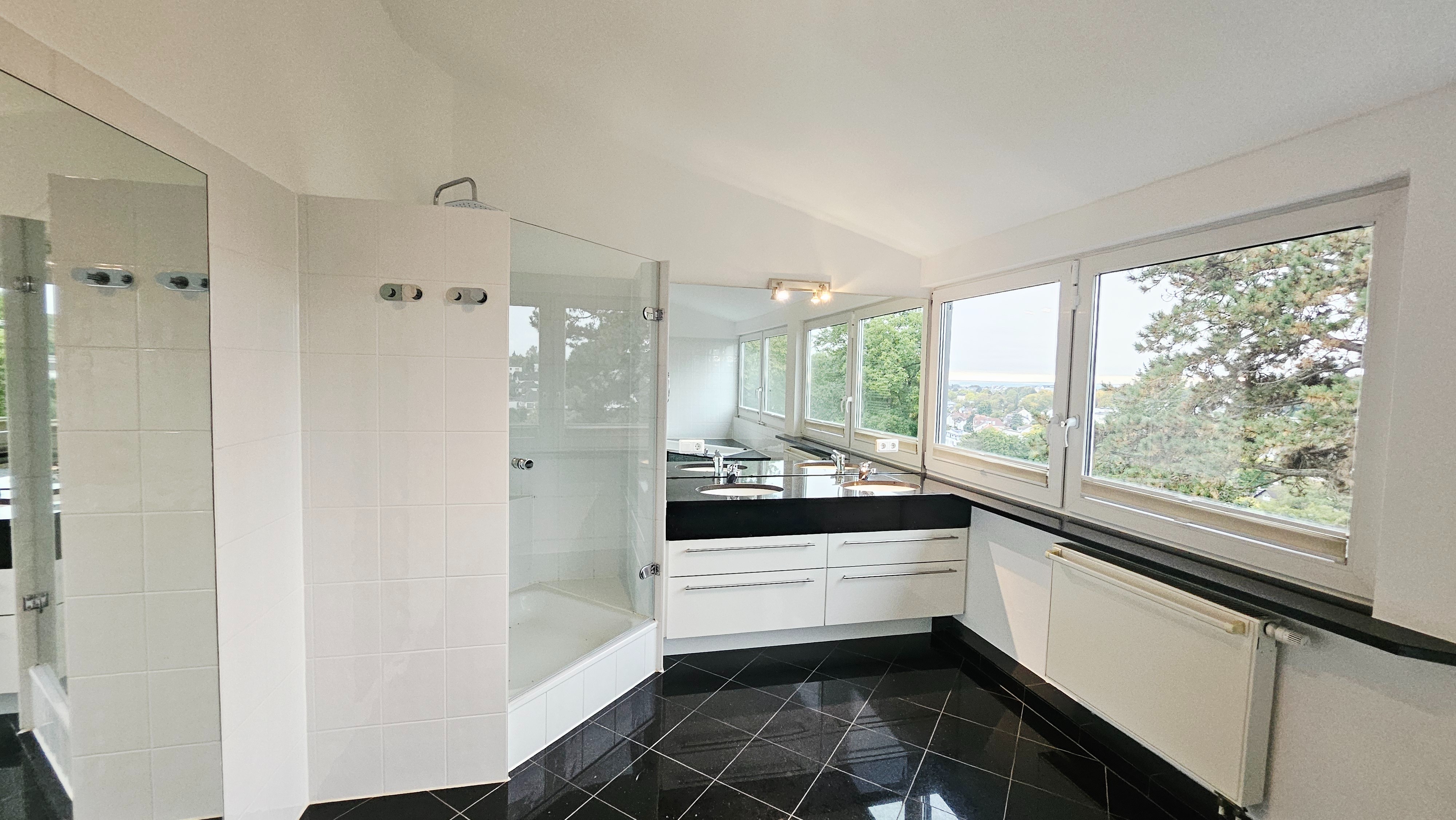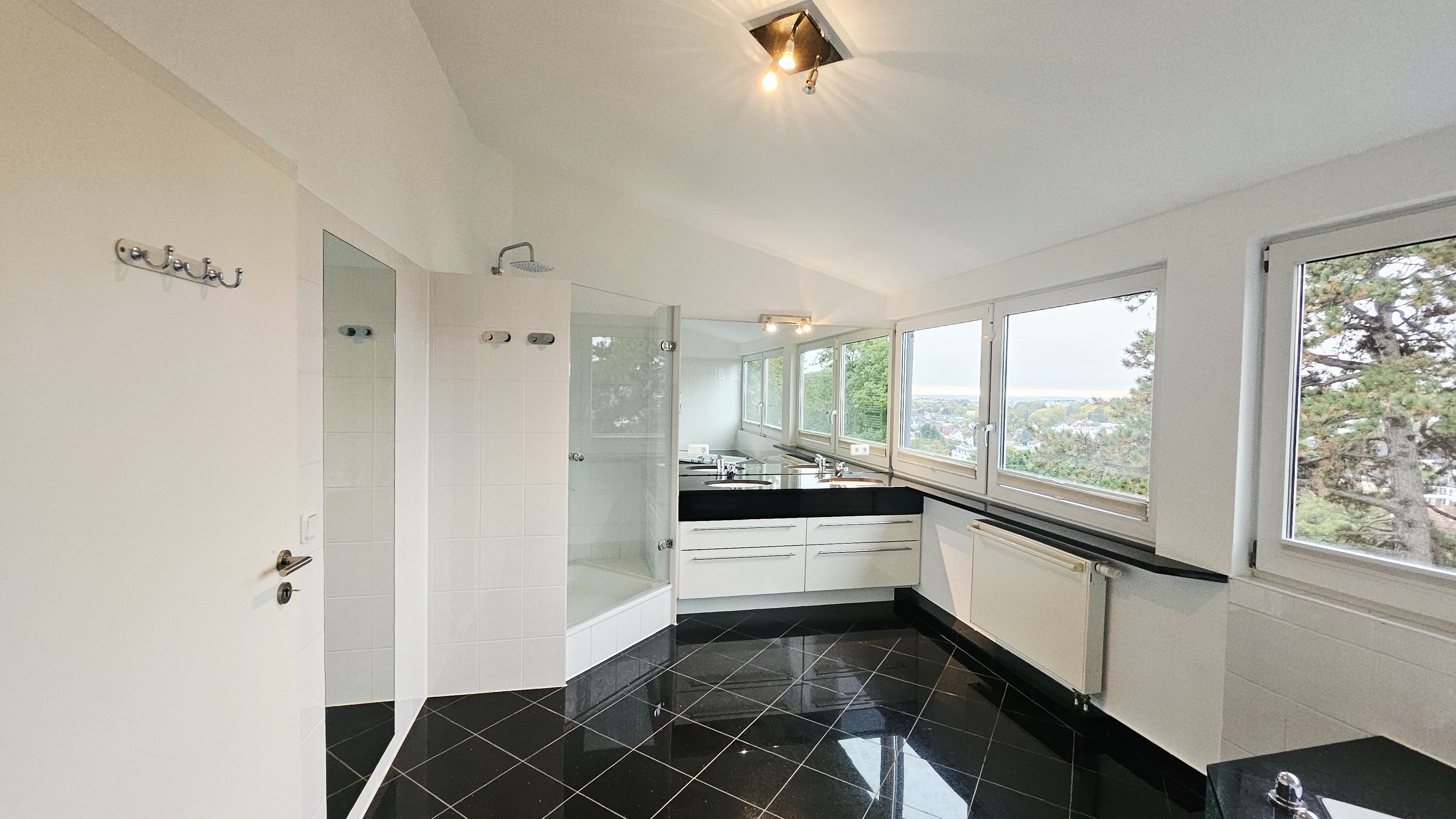 Im Obergeschoss liegen zwei gut geschnittene Schlafzimmer, beide mit Zugang zu einem eigenen Balkon und maßgefertigten Einbauschränken. Das großzügige Badezimmer mit Wanne und Dusche präsentiert sich hell und stilvoll – ein Ort zum Entspannen.