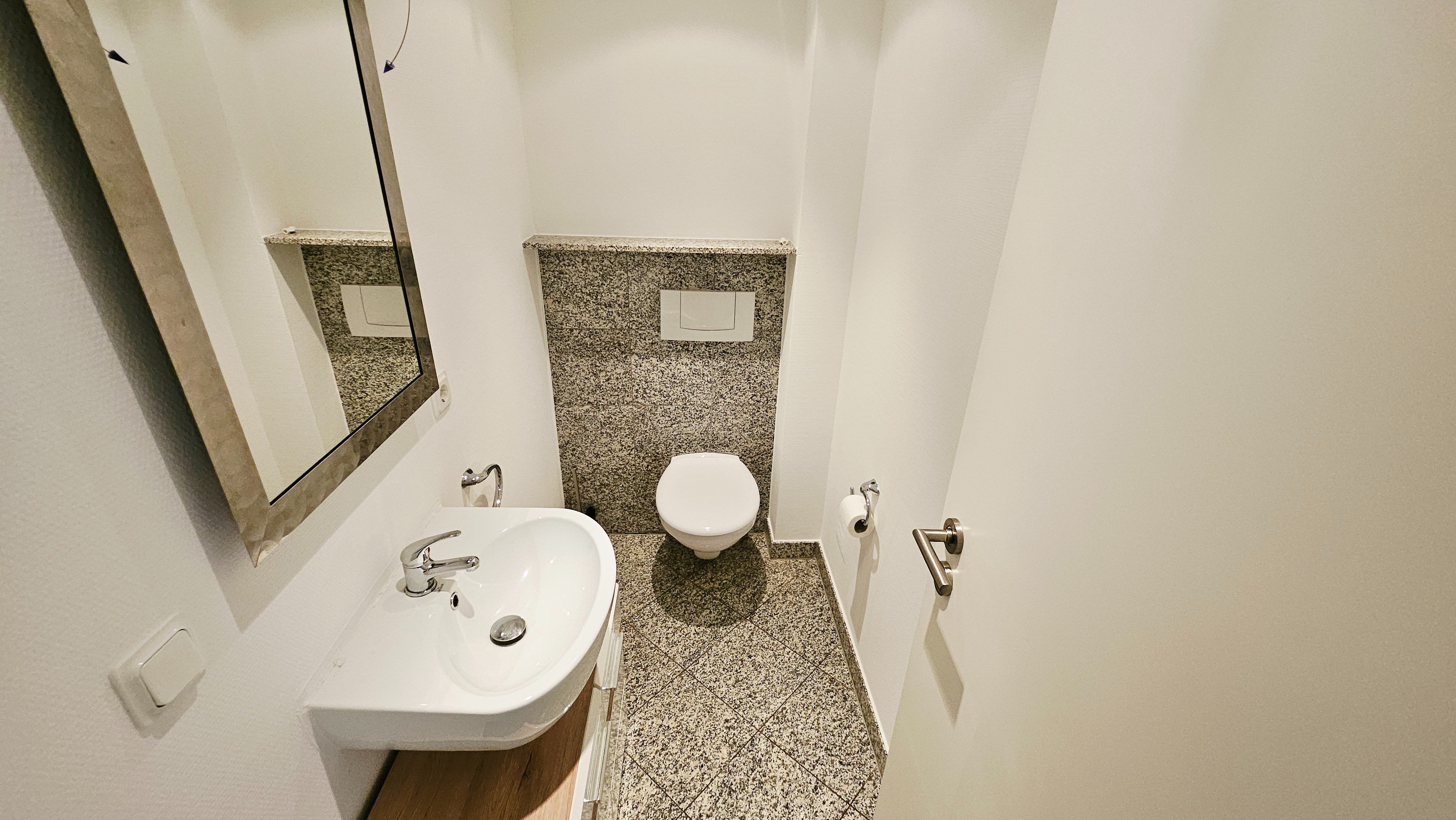 Ein Arbeitszimmer, das sich ideal als Homeoffice oder Gästezimmer nutzen lässt, sowie ein Gäste-WC runden das Raumangebot auf dieser Ebene ab.