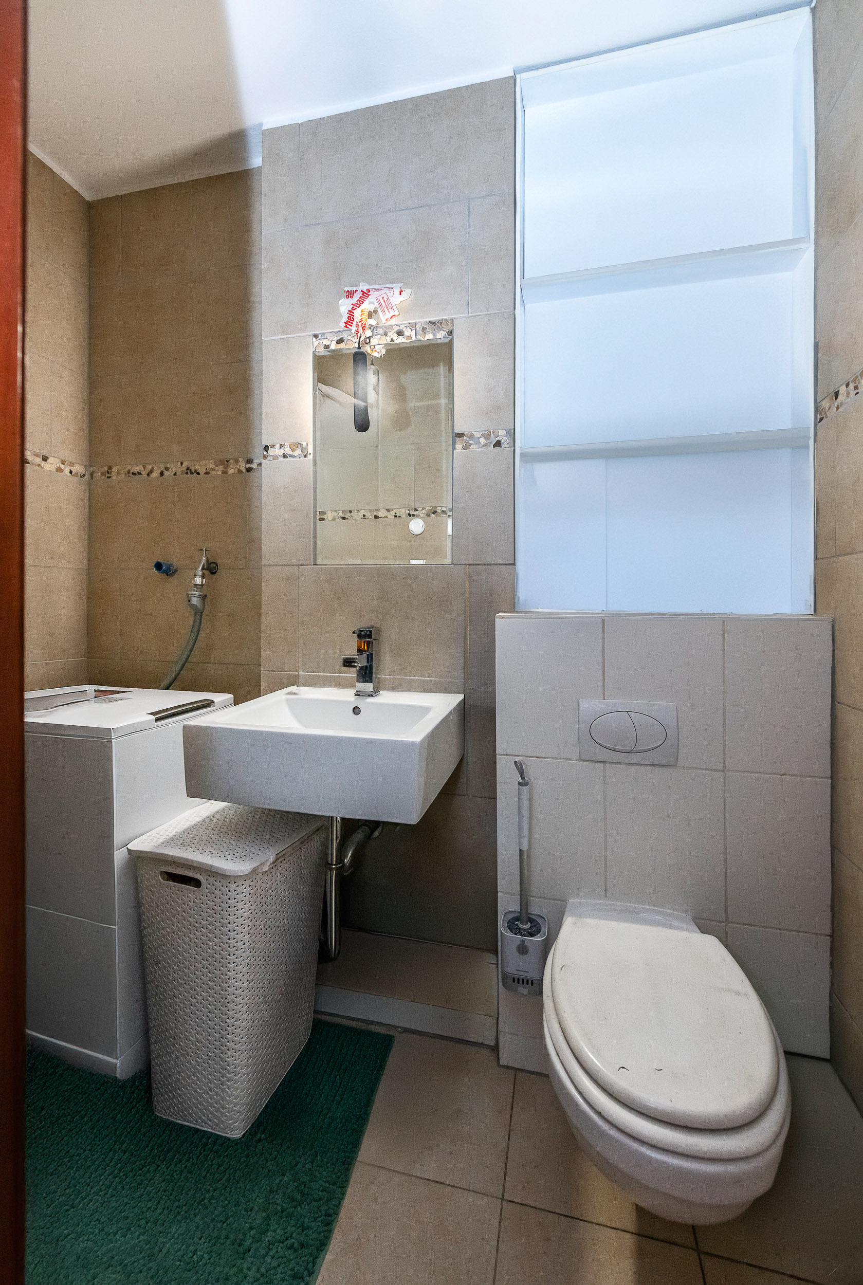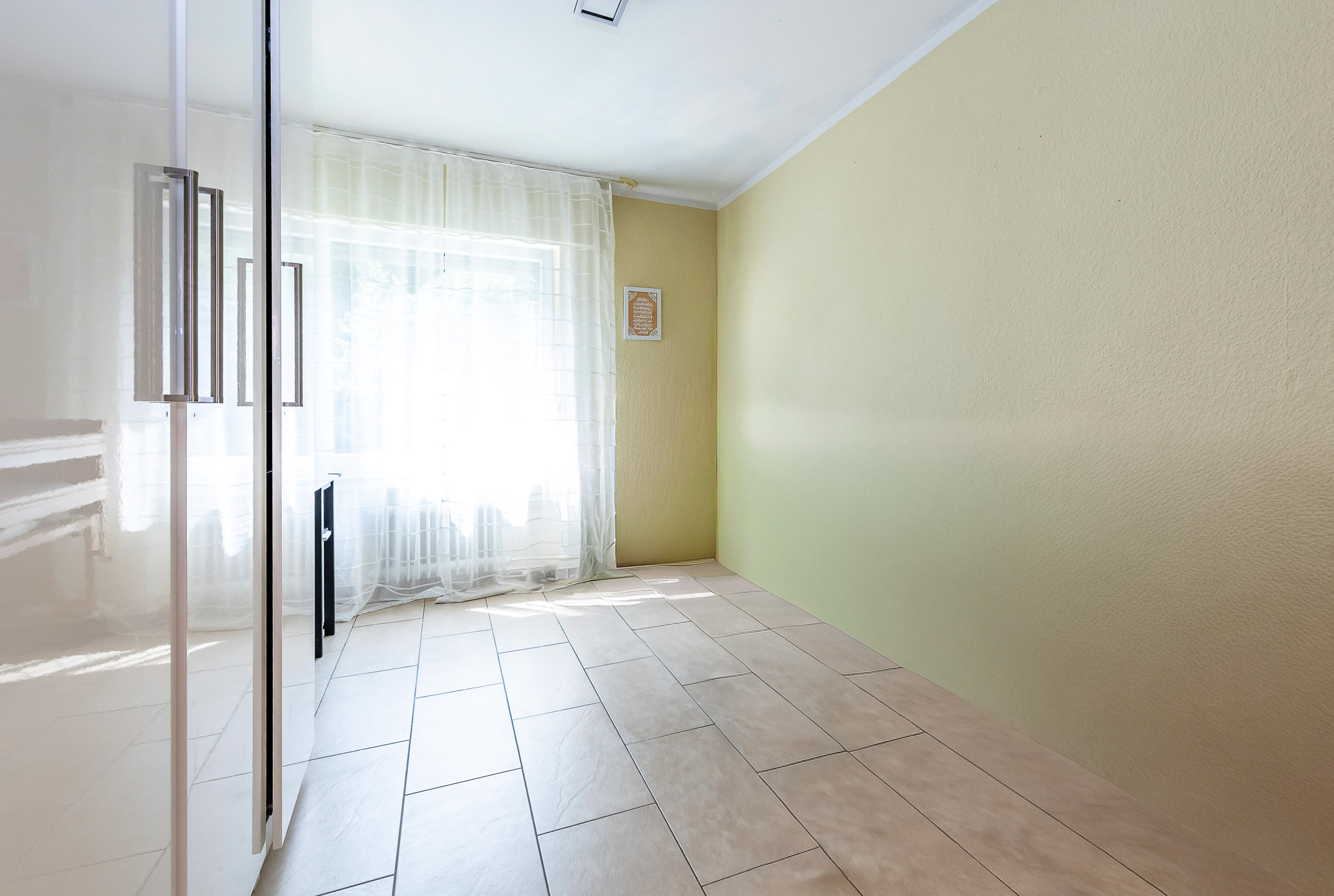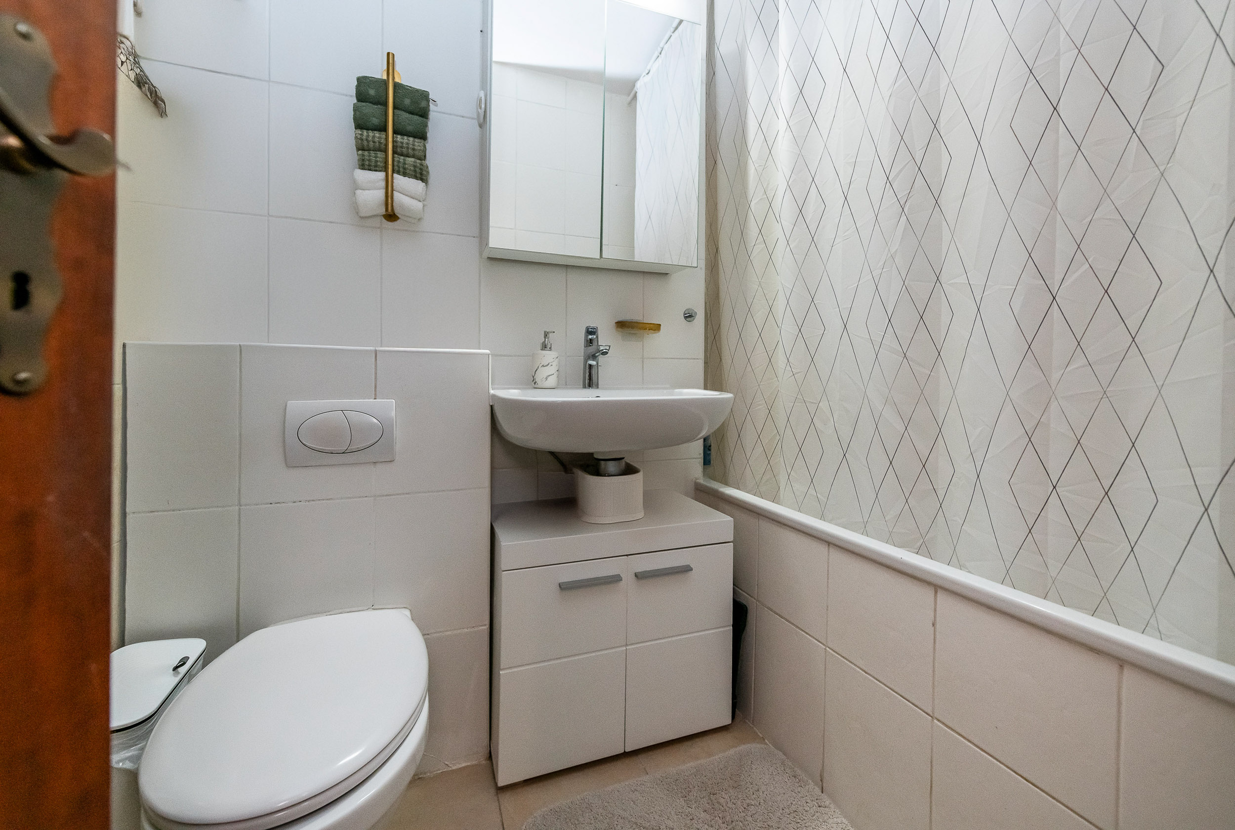 Das Badezimmer ist mit einer Badewanne sowie einem Waschbecken und WC ausgestattet. Zudem ergänzt ein praktisches Gäste-WC, das ebenfalls vom Flur zugänglich ist, die Wohnung – eine optimale Lösung für Mehrpersonenhaushalte oder wenn Besuch kommt. Hier findet momentan die Waschmaschine ihren Platz, die Anschlüsse für eine Dusche sind jedoch vorhanden.