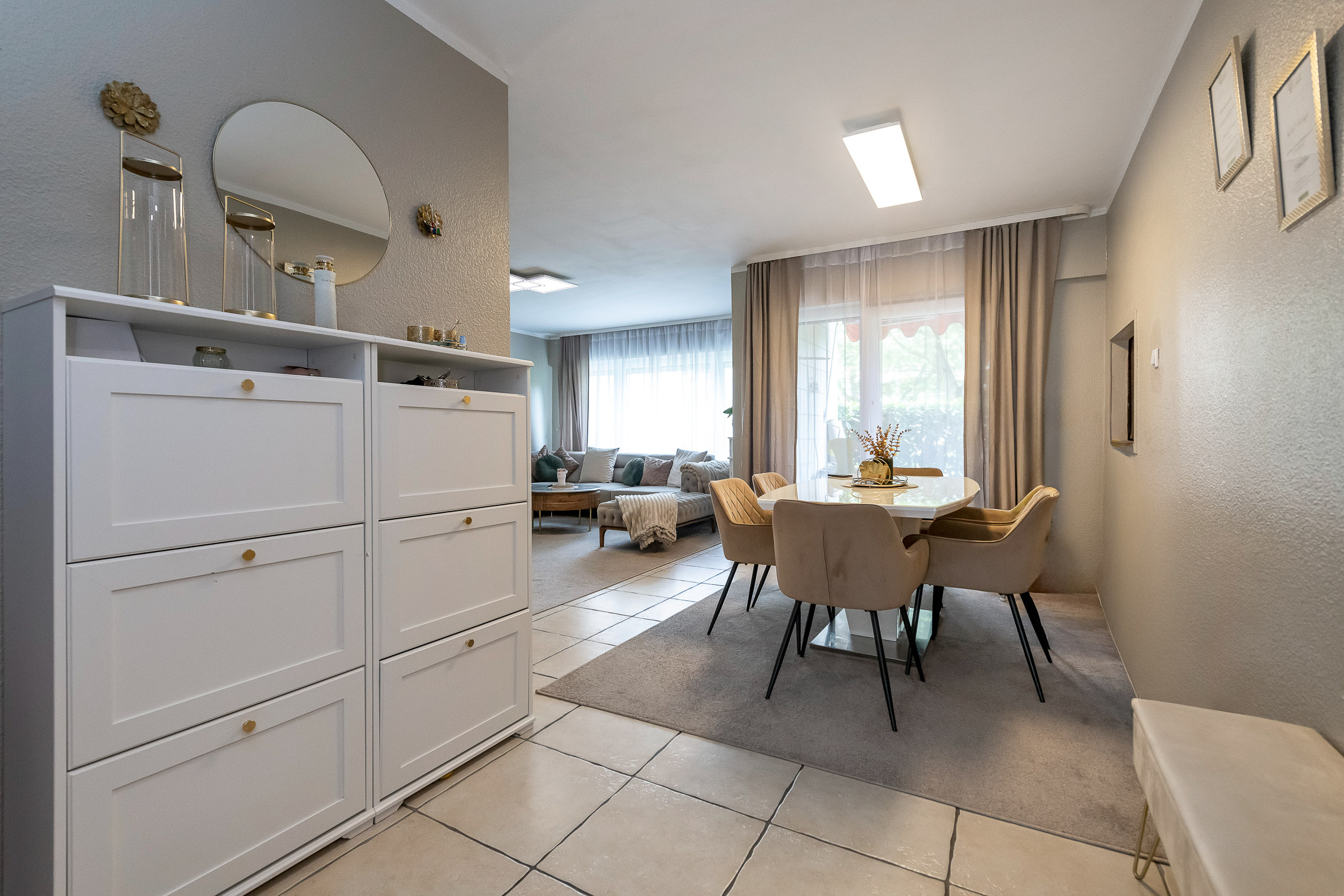 Das Herzstück der Wohnung bildet der weitläufige Wohn- und Essbereich, der dank der offenen Raumgestaltung und großzügigen Fensterflächen ein besonders luftiges und einladendes Wohnambiente schafft. Von diesem lichtdurchfluteten Raum aus gelangen Sie auf die sonnige Terrasse, die mit dem Blick ins Grüne zum Entspannen und Verweilen an der frischen Luft einlädt.