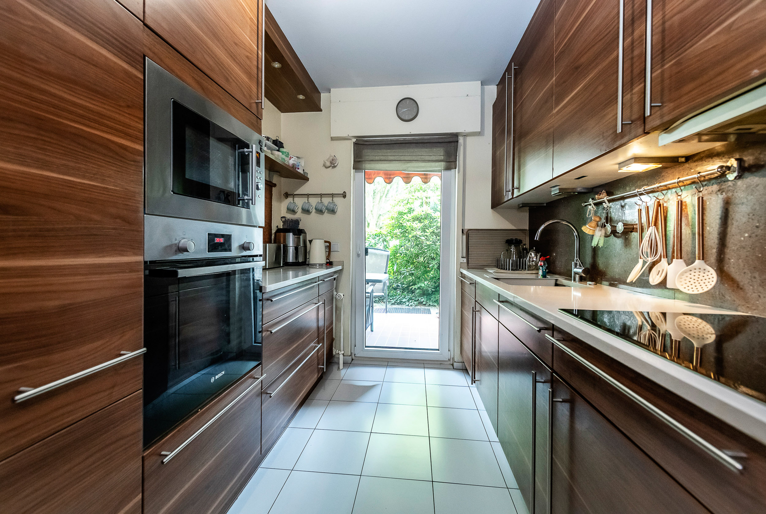Die separate Küche ist ein praktischer Arbeitsraum und mit einer maßgefertigten modernen Einbauküche ausgestattet, die hochwertige Boschgeräte umfasst. Hier finden Sie alles, was Sie für den täglichen Bedarf benötigen. Eine Balkontür sorgt für den direkten Zugang zur Terrasse.