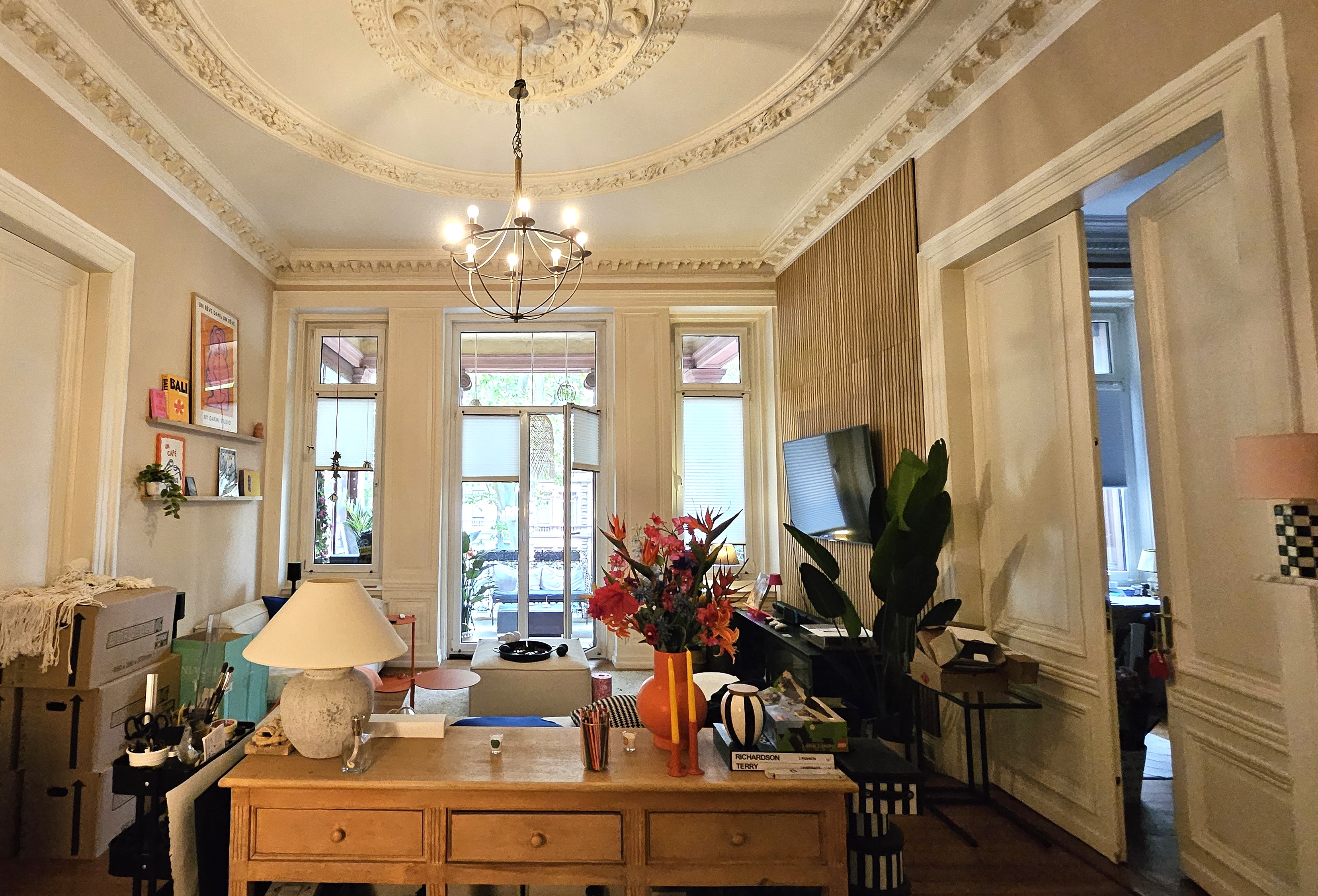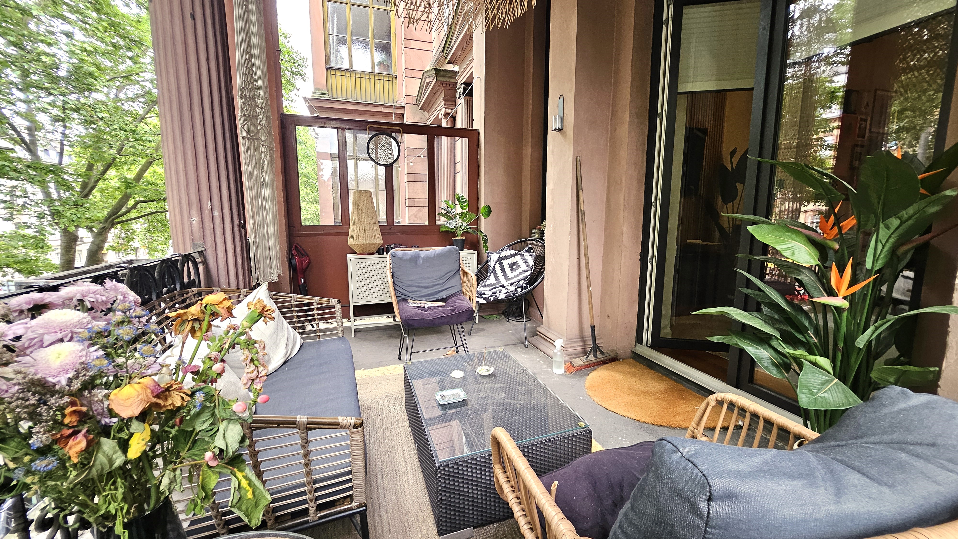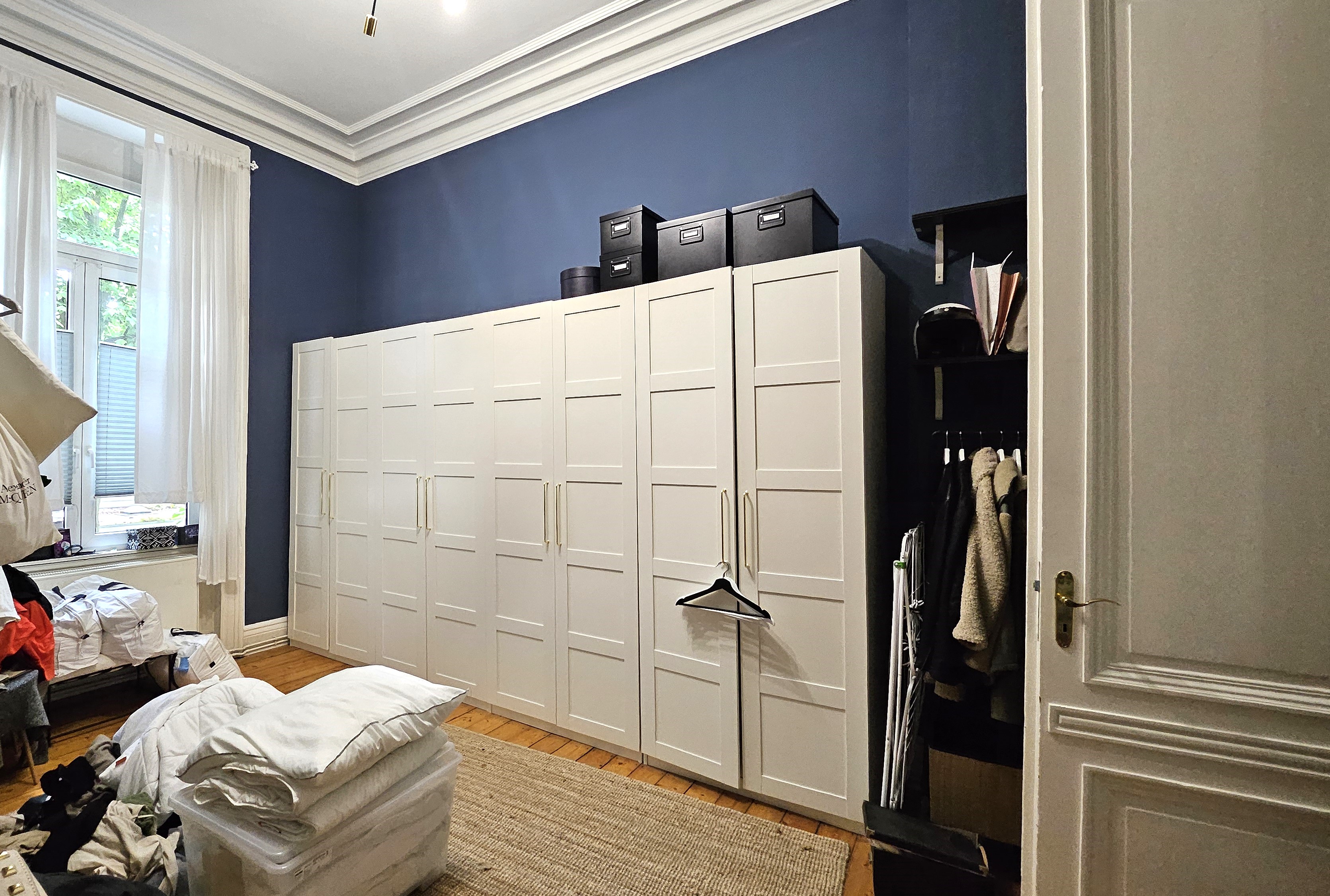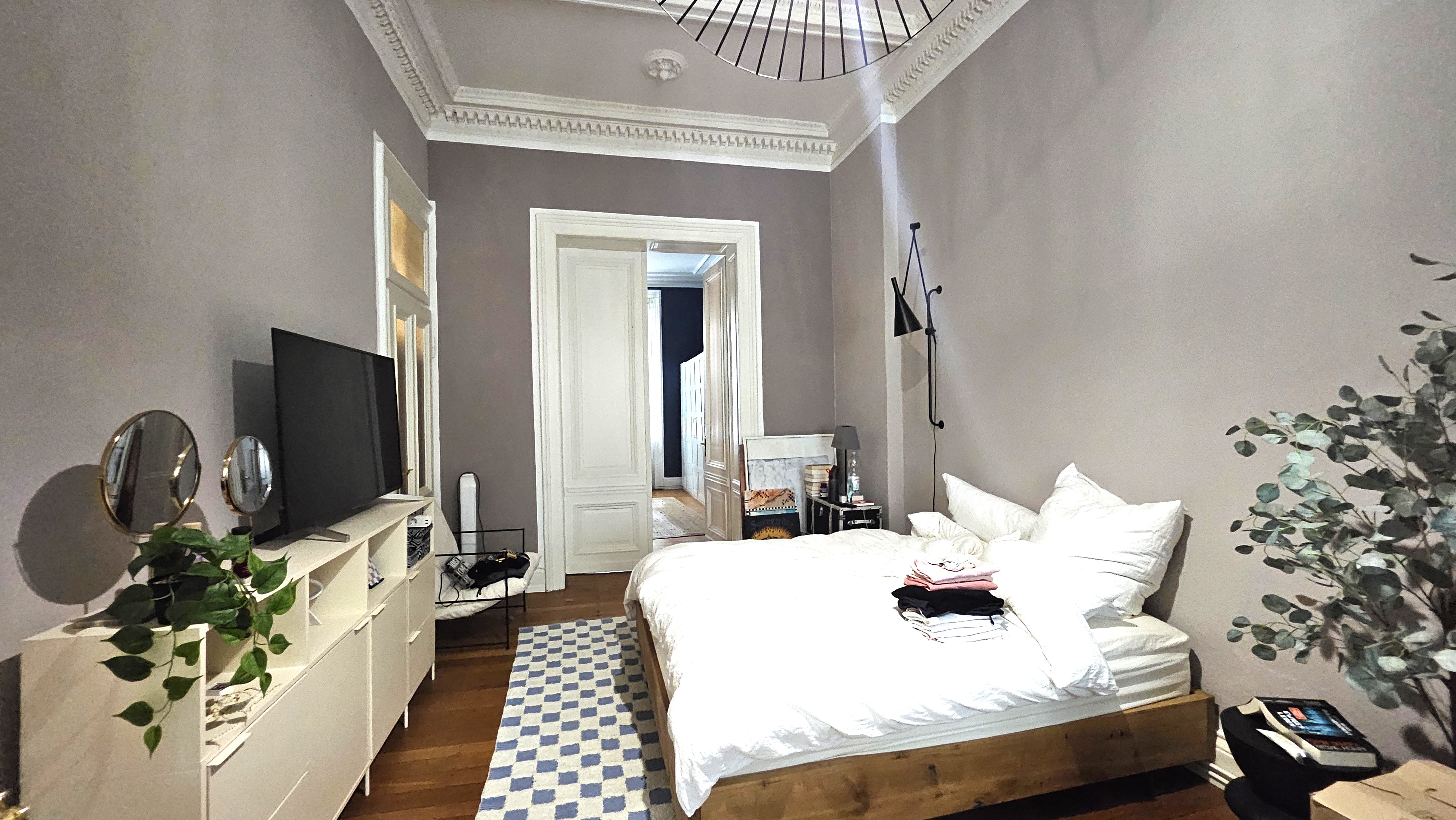 Zur Straßenseite befinden sich 3 große Räume, die alle durch hohe Flügeltüren miteinander verbunden sind. Zwei Räume davon sind auch von Flur aus begehbar, ein gefangenes Zimmer wird vom Wohnzimmer aus betreten. Hier finden Sie alle Komponenten des klassischen Altbaus aus dem Historismus wieder. Neben einem Holzdielenboden und Deckenstuck beeindrucken die Räume auch mit einer überhohen Deckenhöhe von etwa 4,5 m. Ebenfalls zur Straßenseite befindet sich eine große Terrasse.