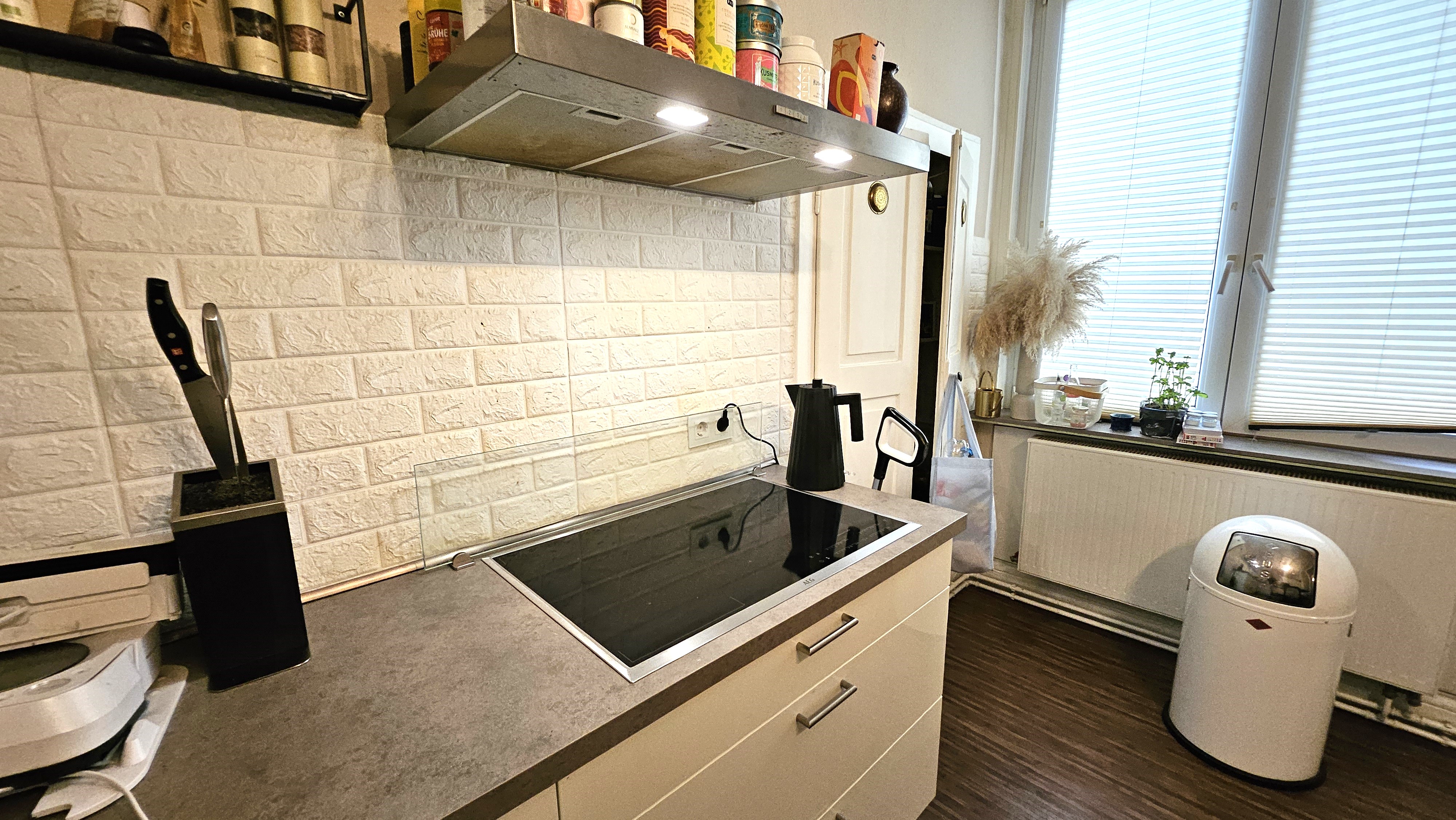 Zum wunderbaren Innenhof mit kleinem Garten befindet sich die Küche, die Platz genug für einen Essbereich bietet. Die Küche wurde 2019 mit einer sehr hochwertigen, modernen Einbauküche ausgestattet. Der alte Kühlschrank (Foto) in der Küche dient mittlerweile als großzügiger Vorratsschrank.