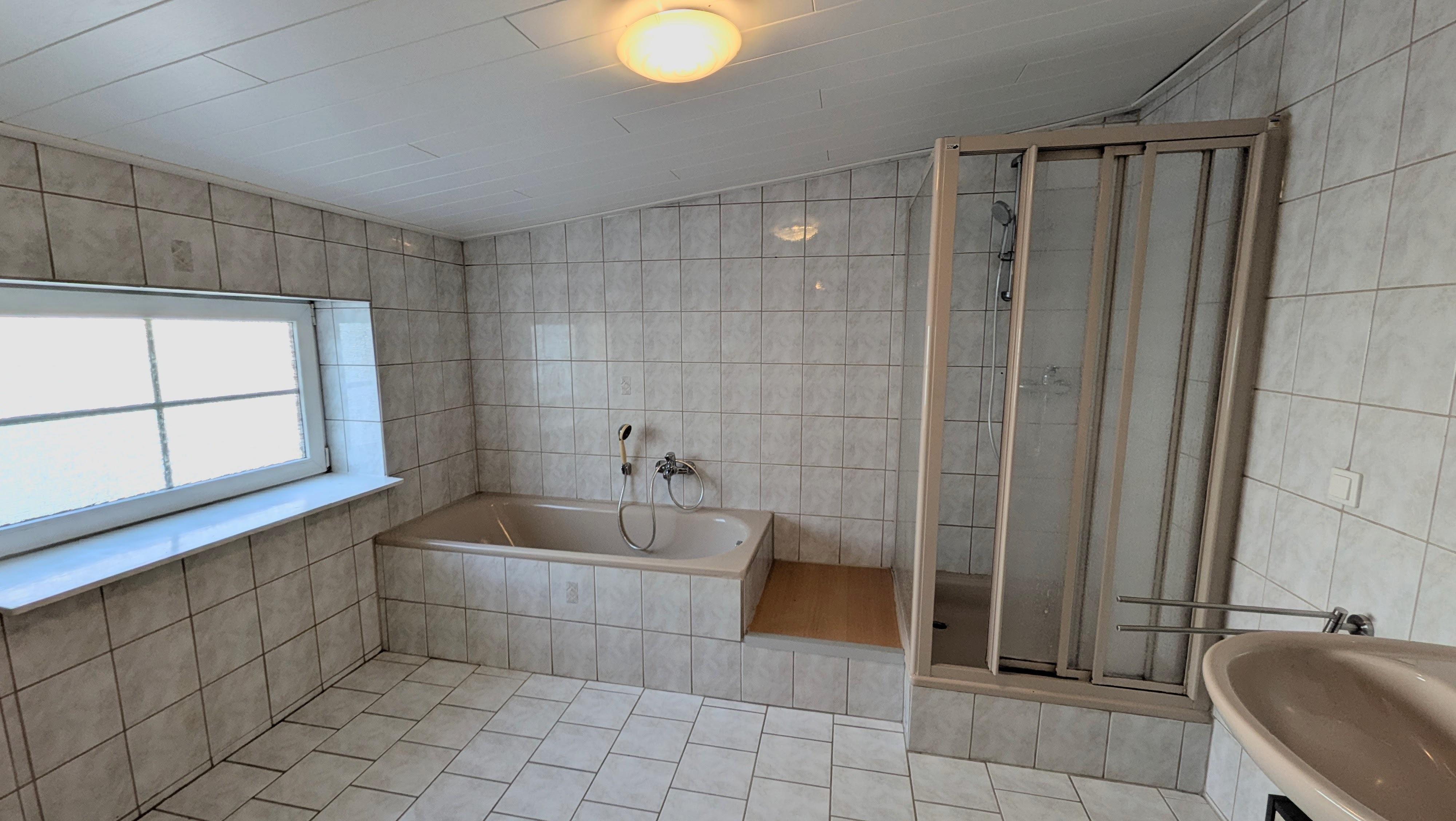 - Tageslicht-Badezimmer mit Badewanne und Dusche