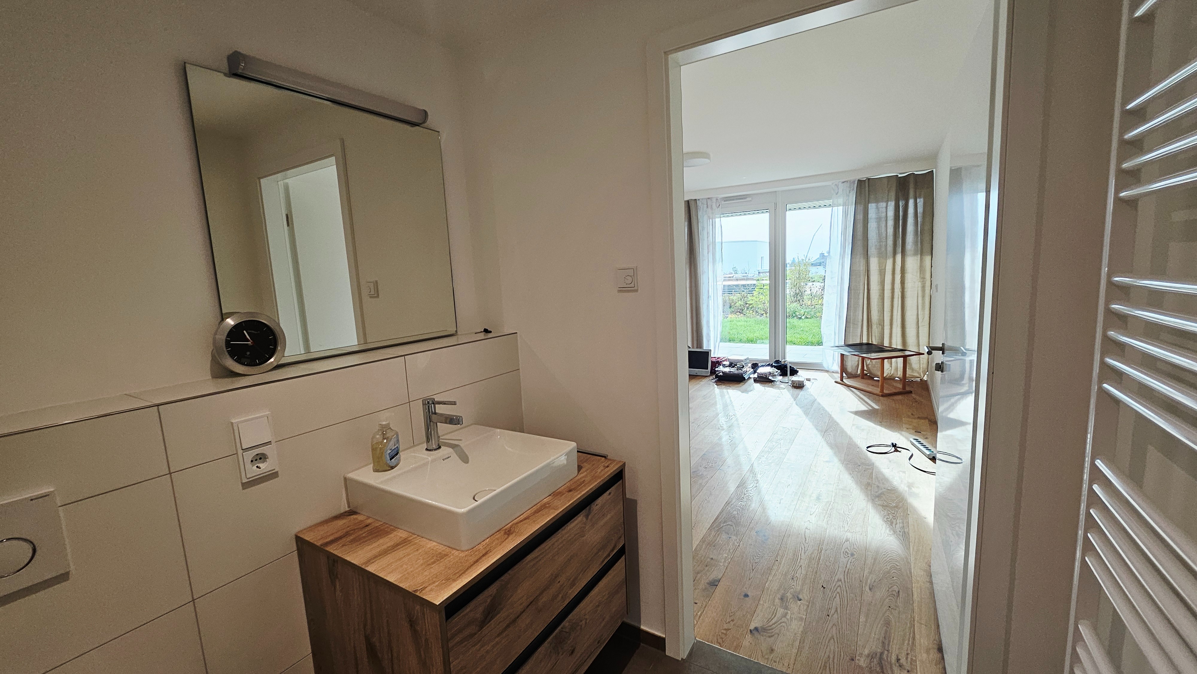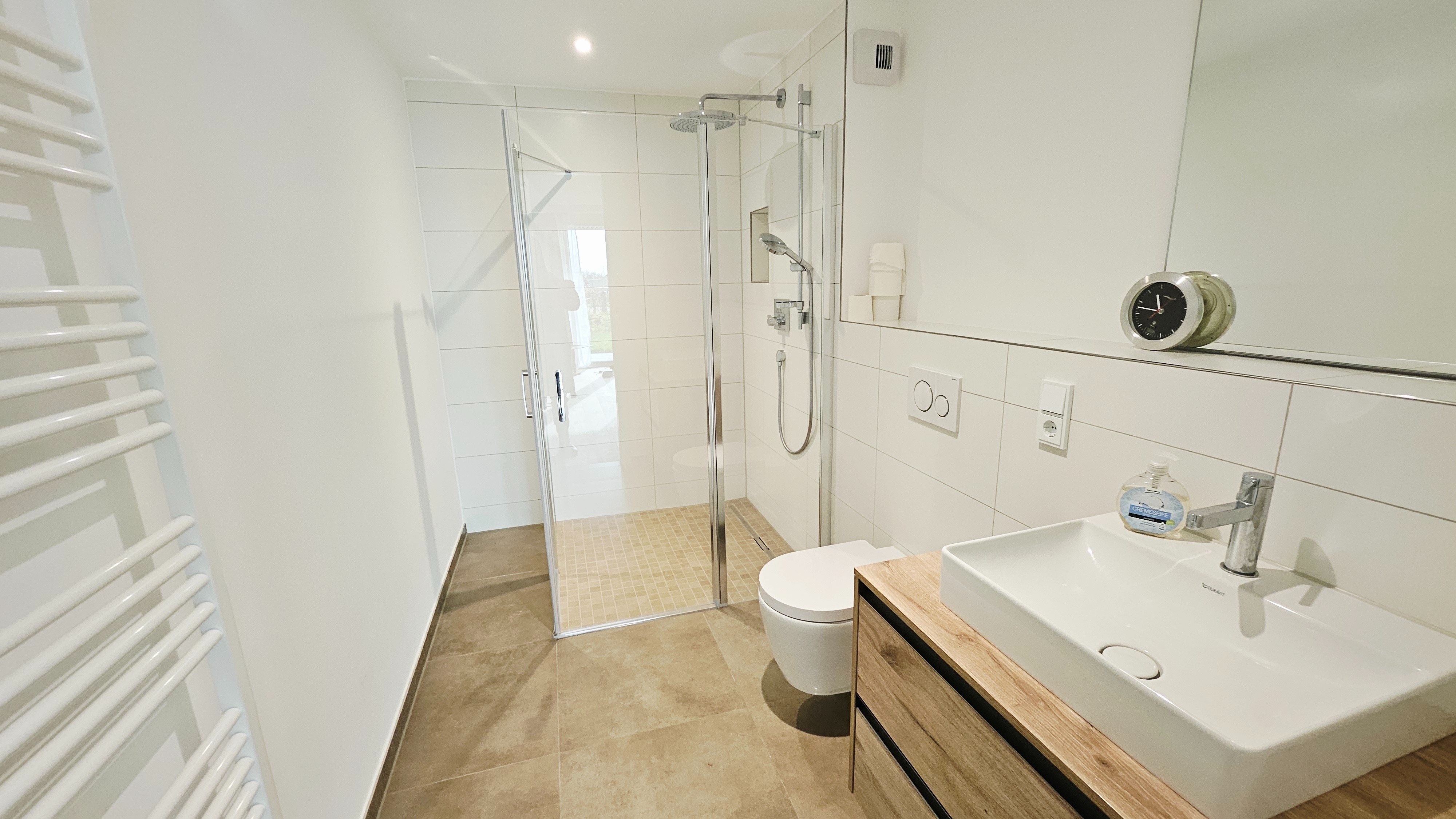 Das großzügige Badezimmer wurde bewusst barrierearm umgesetzt und ist damit besonders seniorenfreundlich. Die bodengleiche Dusche mit beweglichen Glaswänden, großformatige Fliesen und der Badunterschrank schaffen eine sichere und komfortable Umgebung.