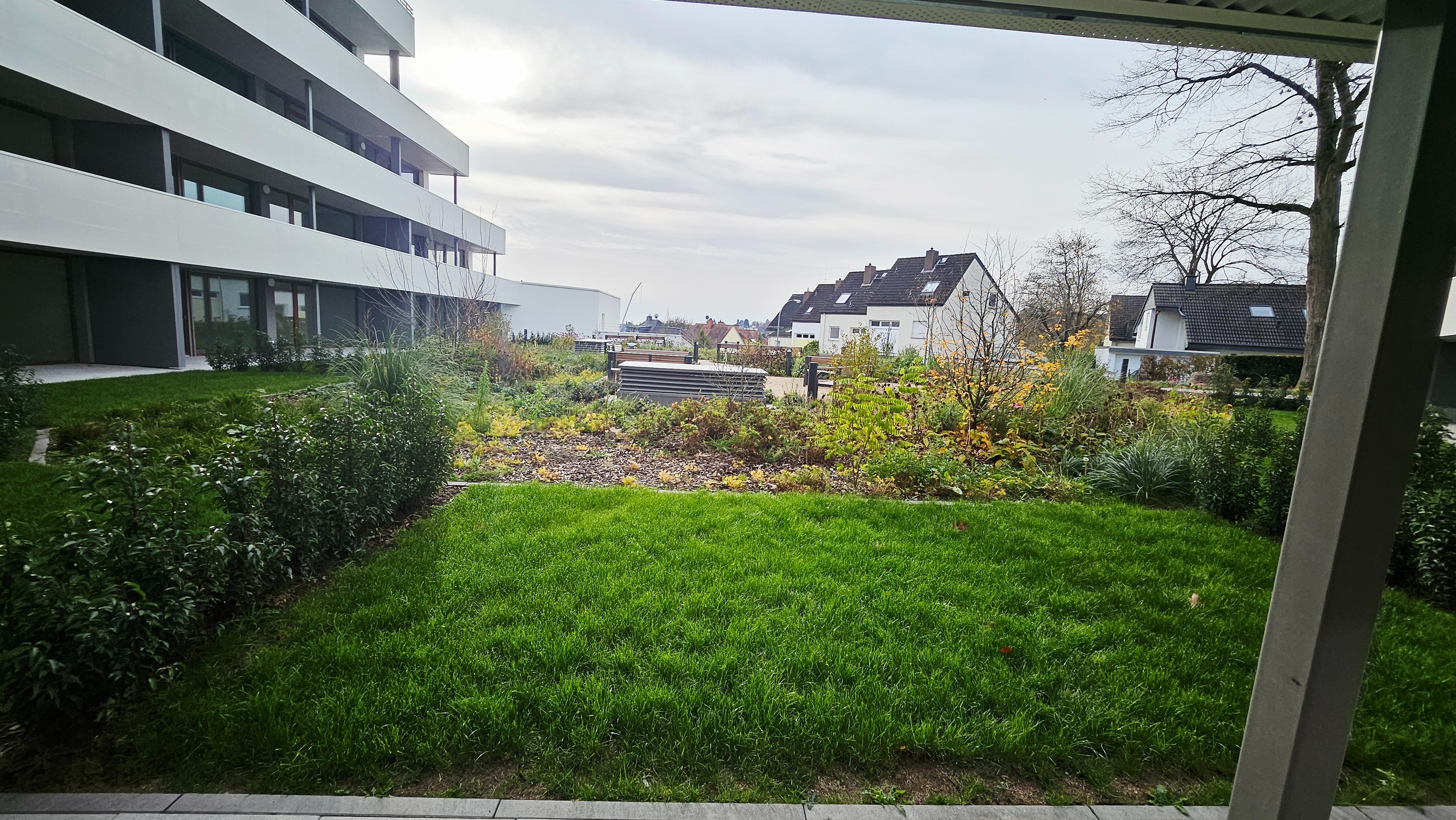 Bereits beim Betreten fällt der gepflegte Eingangsbereich mit einem integrierten Garderobenschrank auf, der für Ordnung sorgt und den Einstieg in die Wohnung besonders komfortabel macht. Der offen gestaltete Wohnbereich wirkt durch die südliche Ausrichtung hell und freundlich. Von hier aus geht es direkt auf die überdachte Terrasse, vor der ein kleiner Rasenanteil liegt. Der Blick führt weiter auf eine begrünte Anlage mit Sitzgelegenheiten – ideal für ruhige Momente an der frischen Luft, ohne weite Wege gehen zu müssen.
