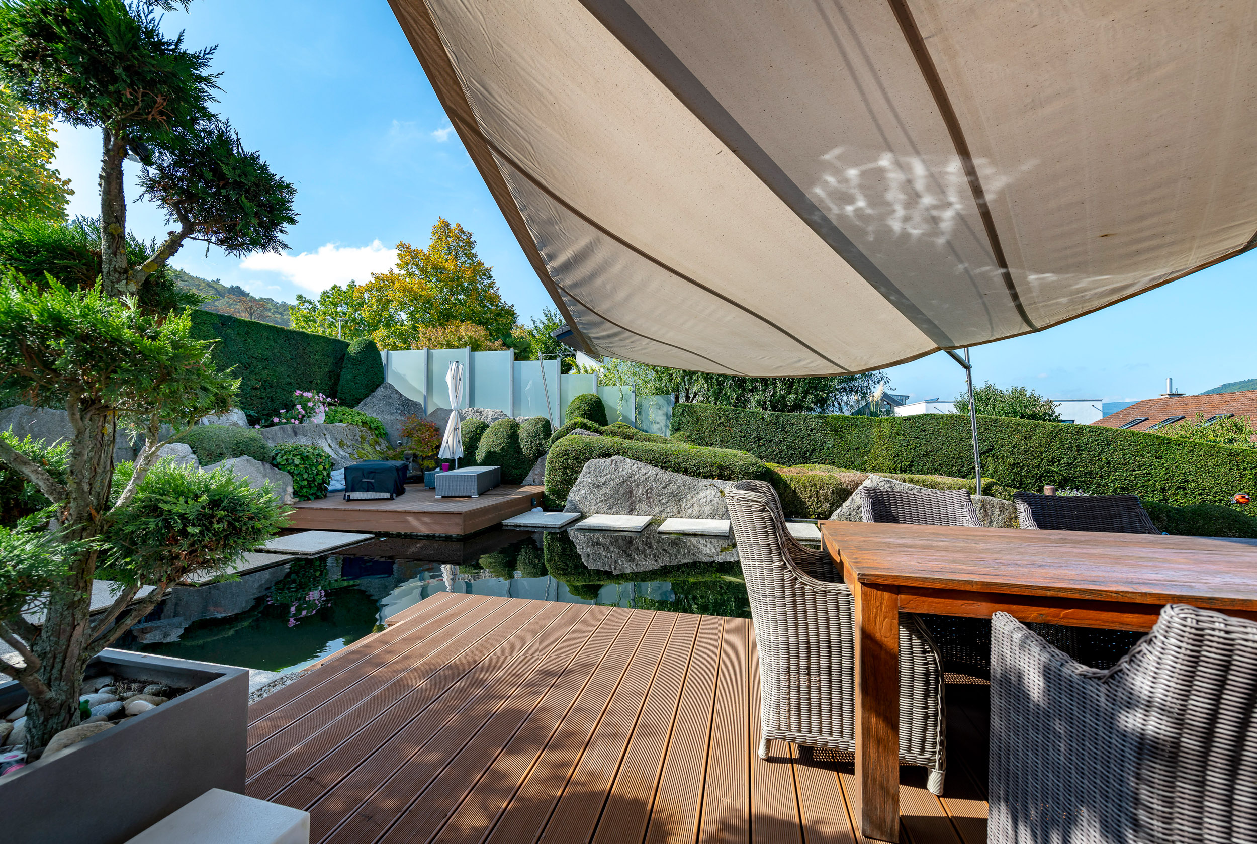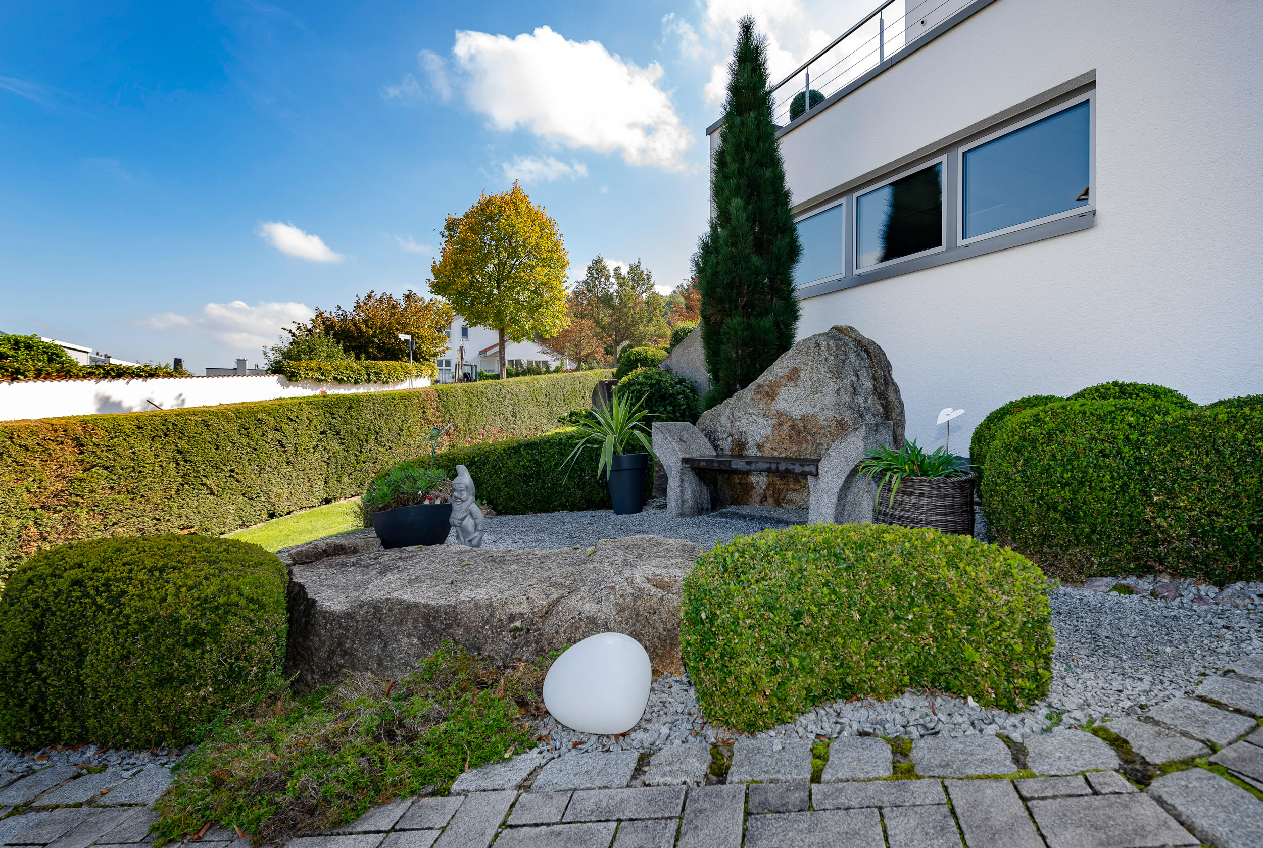 - sonnige Terrasse mit aufwendiger Gartengestaltung