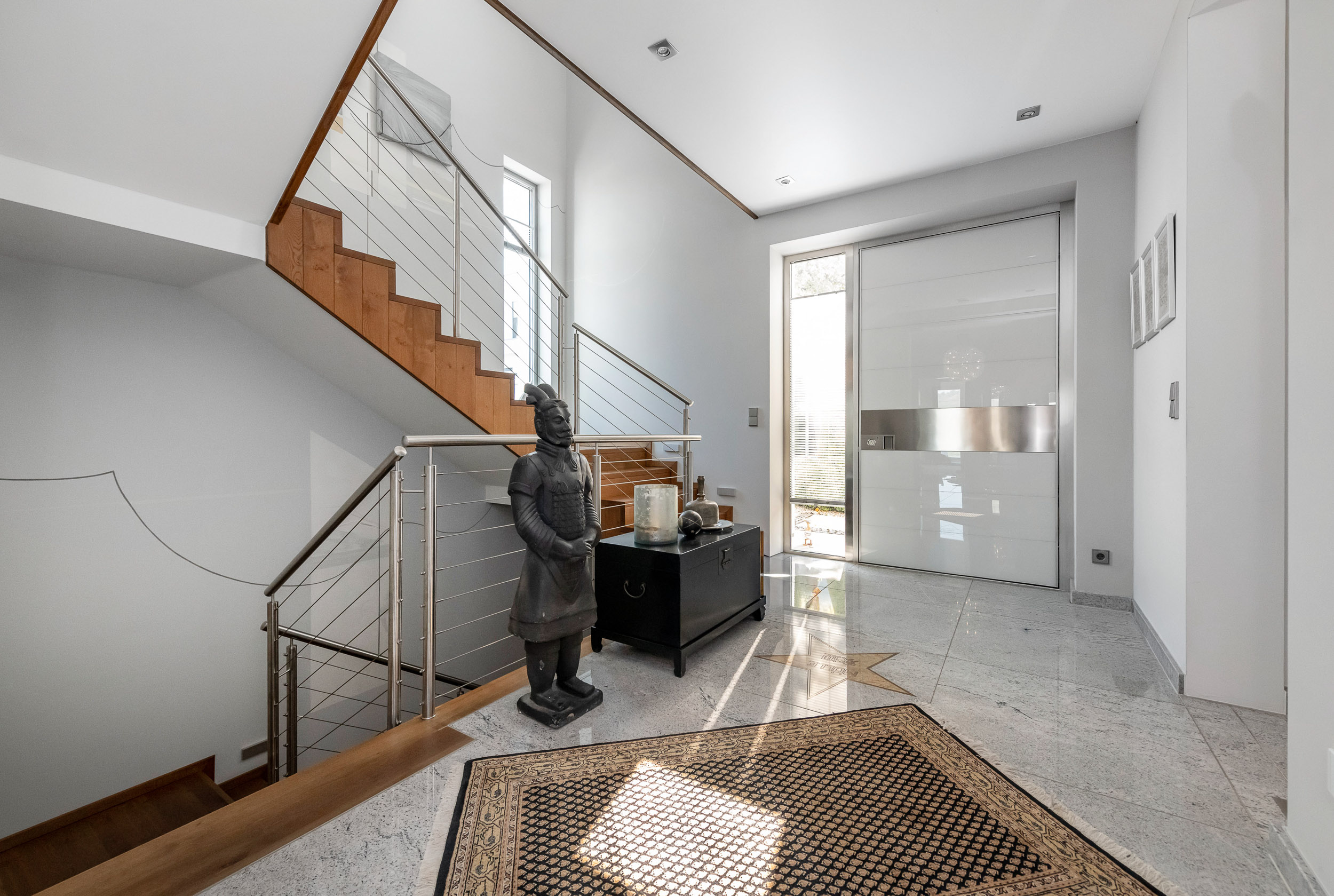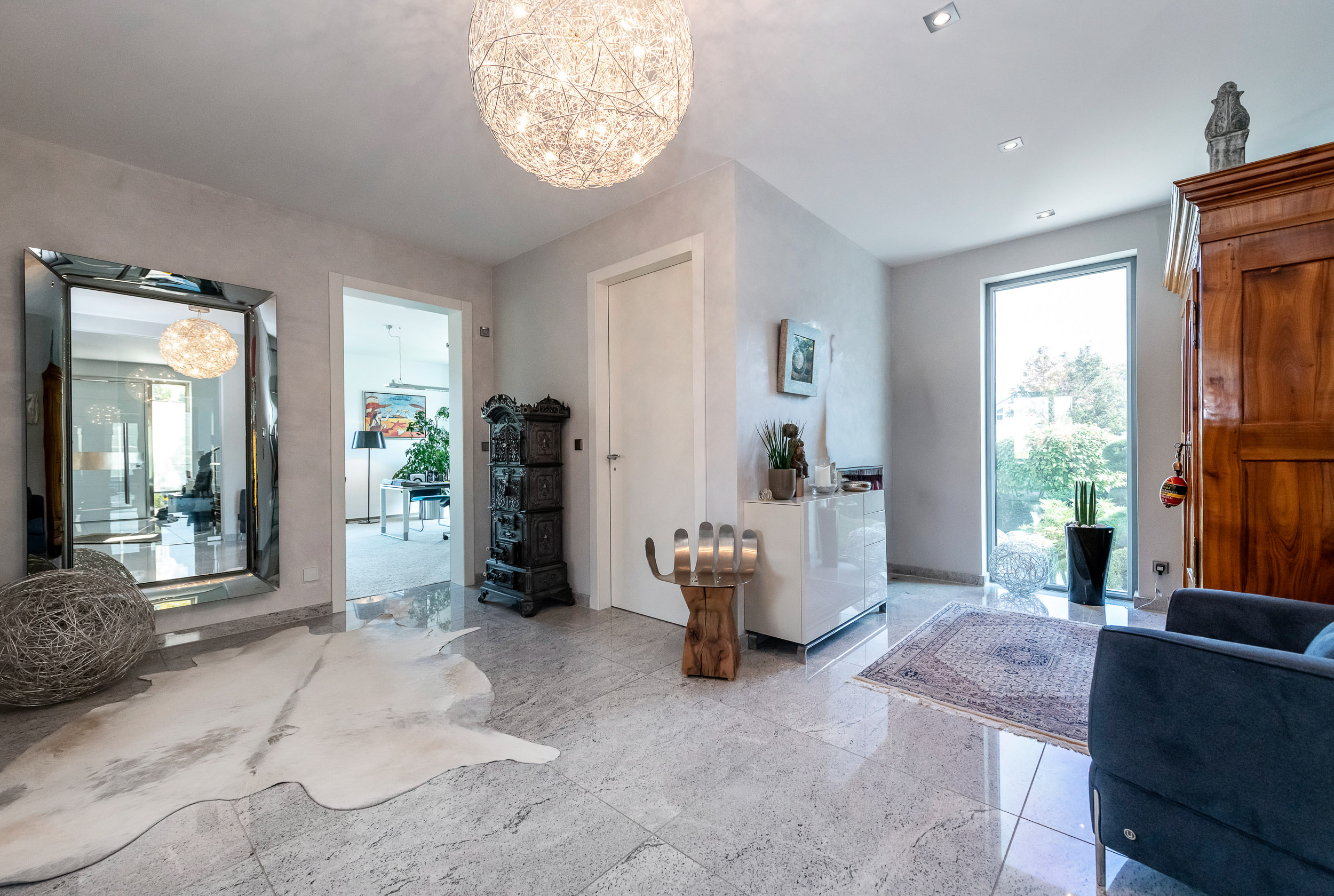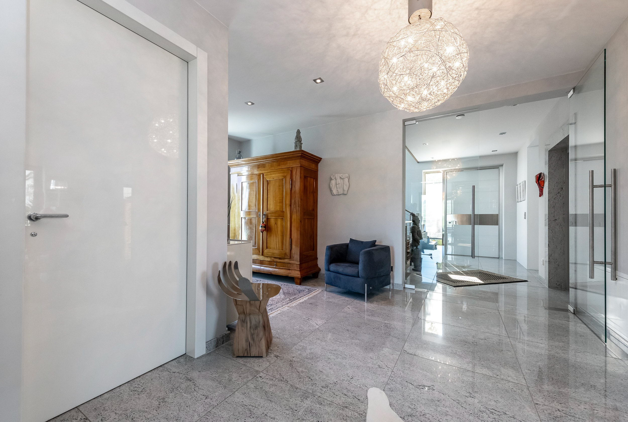 Bereits beim Betreten dieser Villa werden Sie von einem stilvollen Entrée empfangen, das mit einem großen Garderobenbereich ausgestattet ist und durch übergroße Glastüren einen fließenden Übergang in den weitläufigen Wohn- und Essbereich schafft. Großflächige Glasfronten durchfluten den Raum mit natürlichem Licht und schaffen eine harmonische Verbindung zwischen dem luxuriösen Innenraum und der eleganten Sonnenterrasse. Ein Kamin sorgt für eine wohlige Atmosphäre – ideal für gesellige Abende in exquisitem Rahmen.