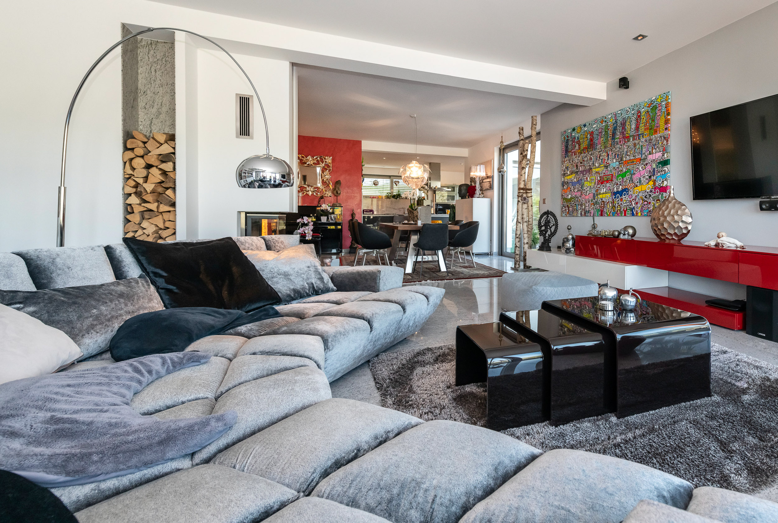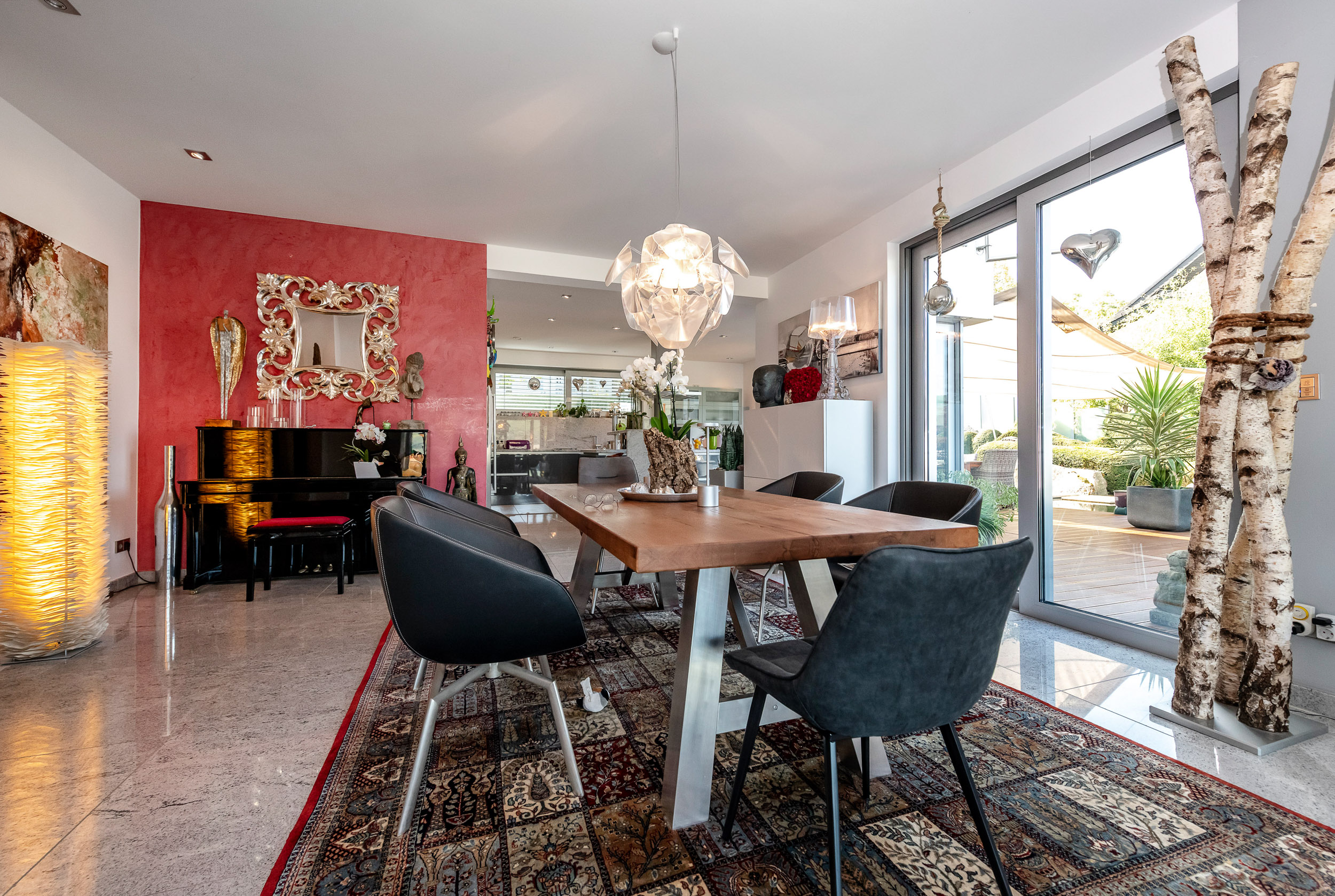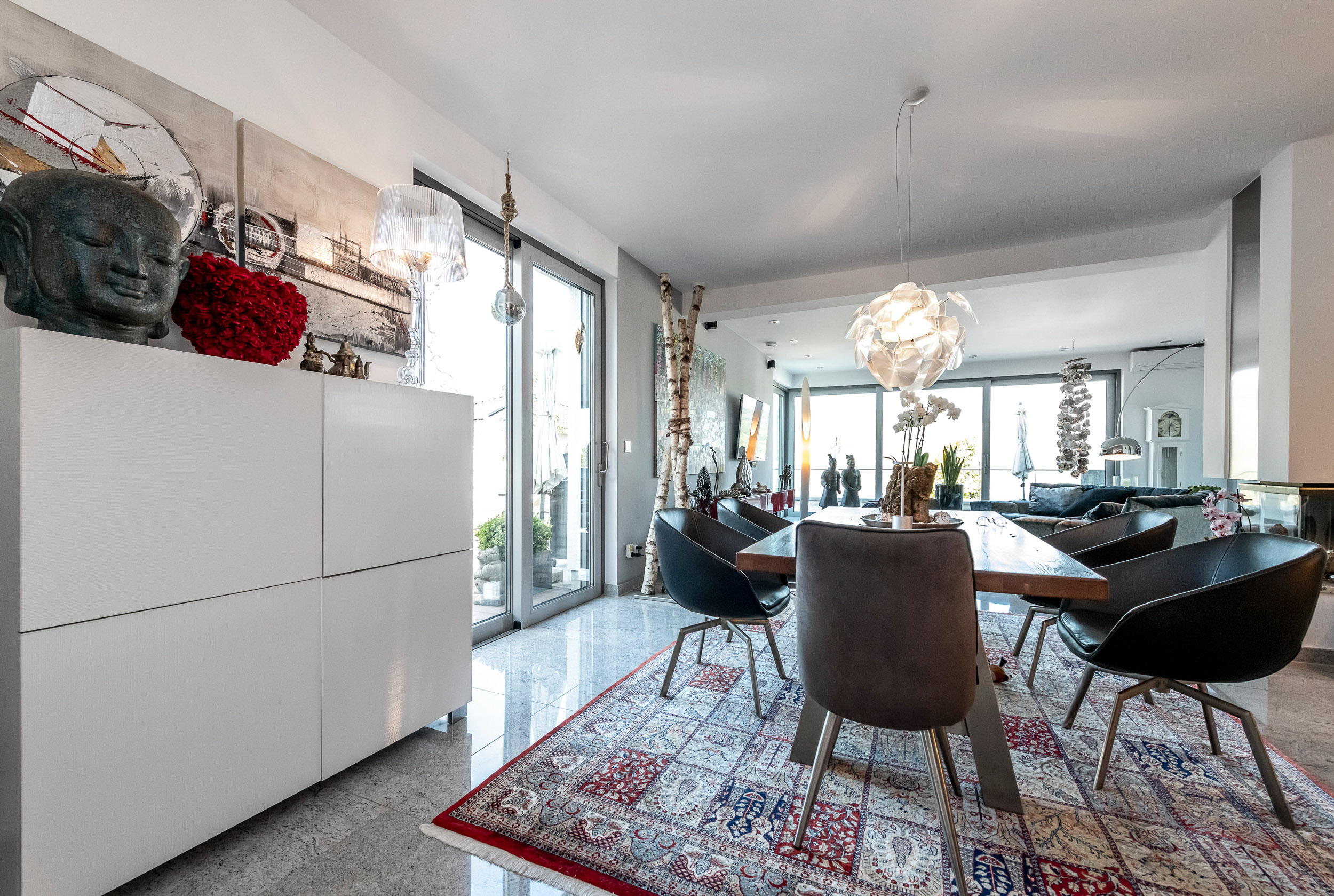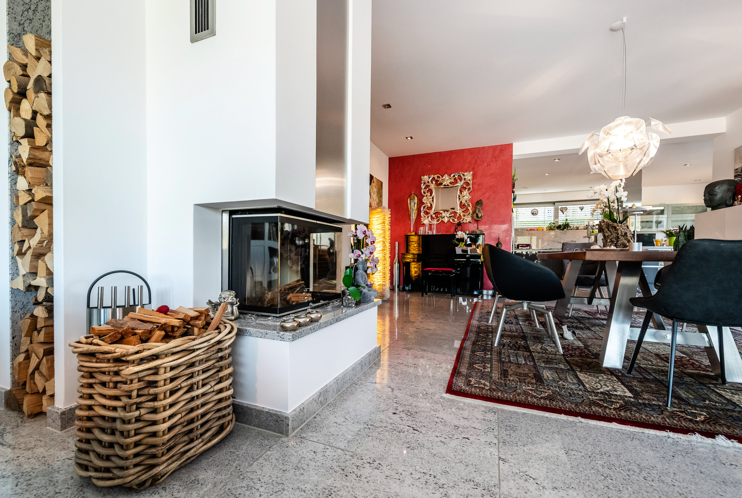 Bereits beim Betreten dieser Villa werden Sie von einem stilvollen Entrée empfangen, das mit einem großen Garderobenbereich ausgestattet ist und durch übergroße Glastüren einen fließenden Übergang in den weitläufigen Wohn- und Essbereich schafft. Großflächige Glasfronten durchfluten den Raum mit natürlichem Licht und schaffen eine harmonische Verbindung zwischen dem luxuriösen Innenraum und der eleganten Sonnenterrasse. Ein Kamin sorgt für eine wohlige Atmosphäre – ideal für gesellige Abende in exquisitem Rahmen.