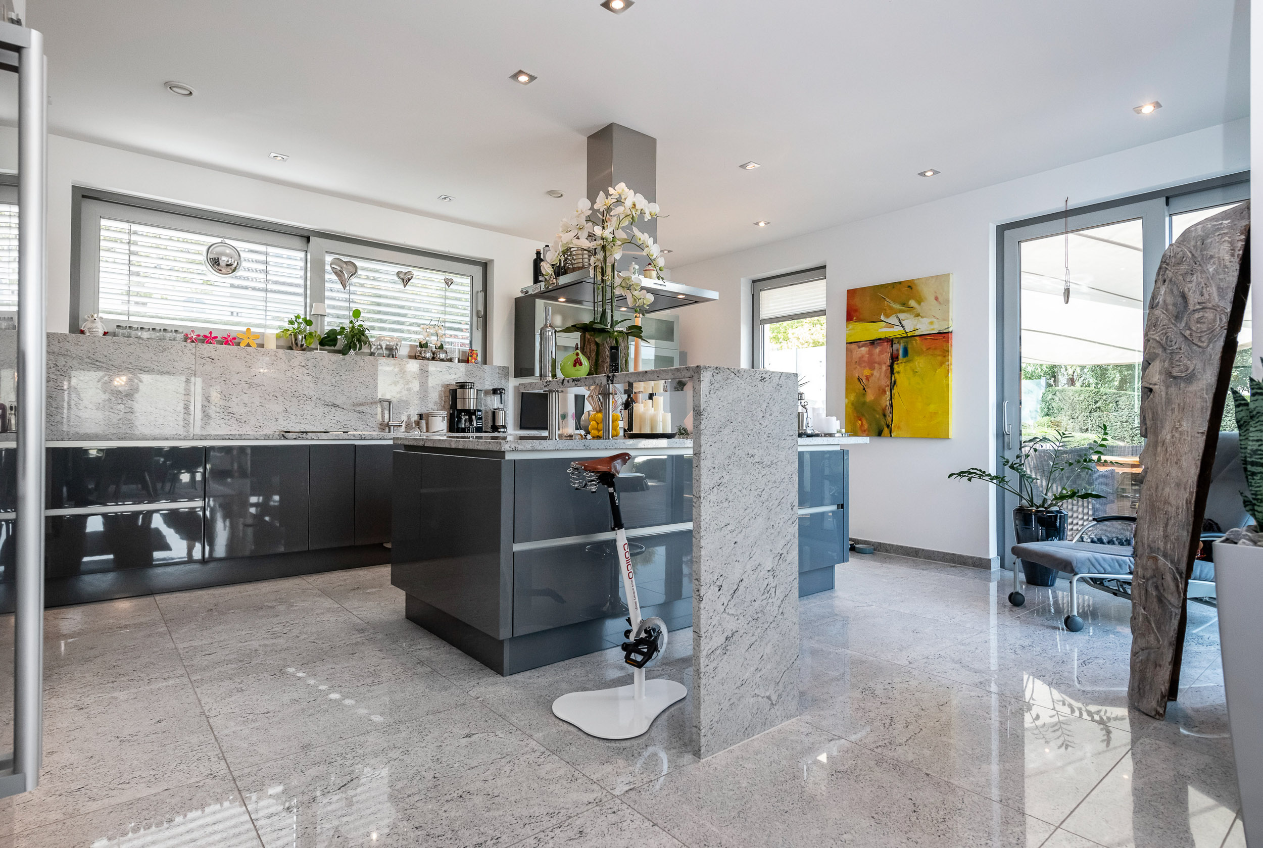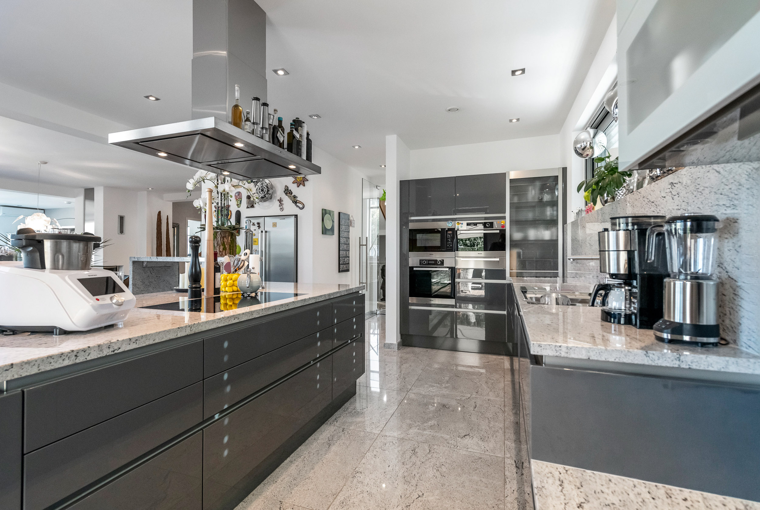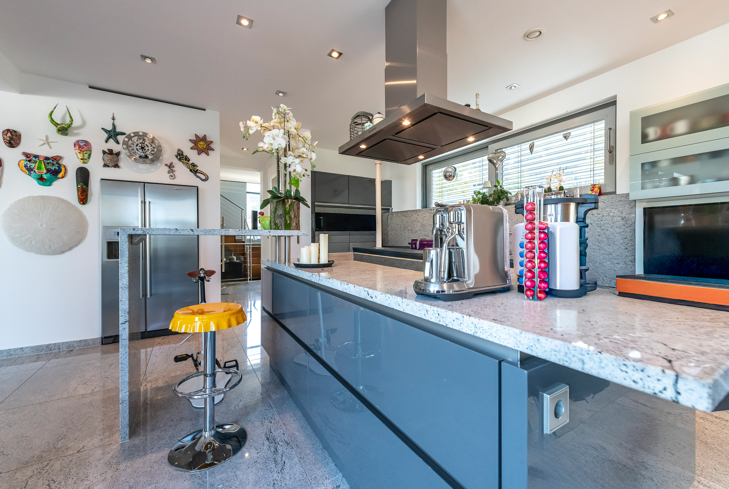 Die moderne, offene Küche mit separater Speisekammer ist ein wahres Paradies für Gourmetliebhaber. Sie ist mit erstklassigen Geräten ausgestattet und lässt keine Wünsche offen. Hier können Sie stilvolle Dinner mit Freunden zelebrieren oder entspannte Familienabende in gemütlichem Ambiente genießen. Der direkte Zugang zur Terrasse ermöglicht es Ihnen, bei jedem Anlass die herrliche Aussicht zu genießen und den Außenbereich in das Geschehen mit einzubeziehen.