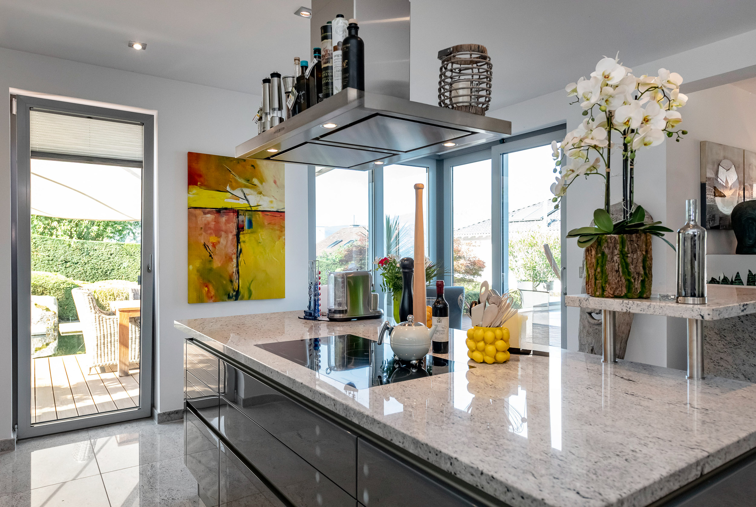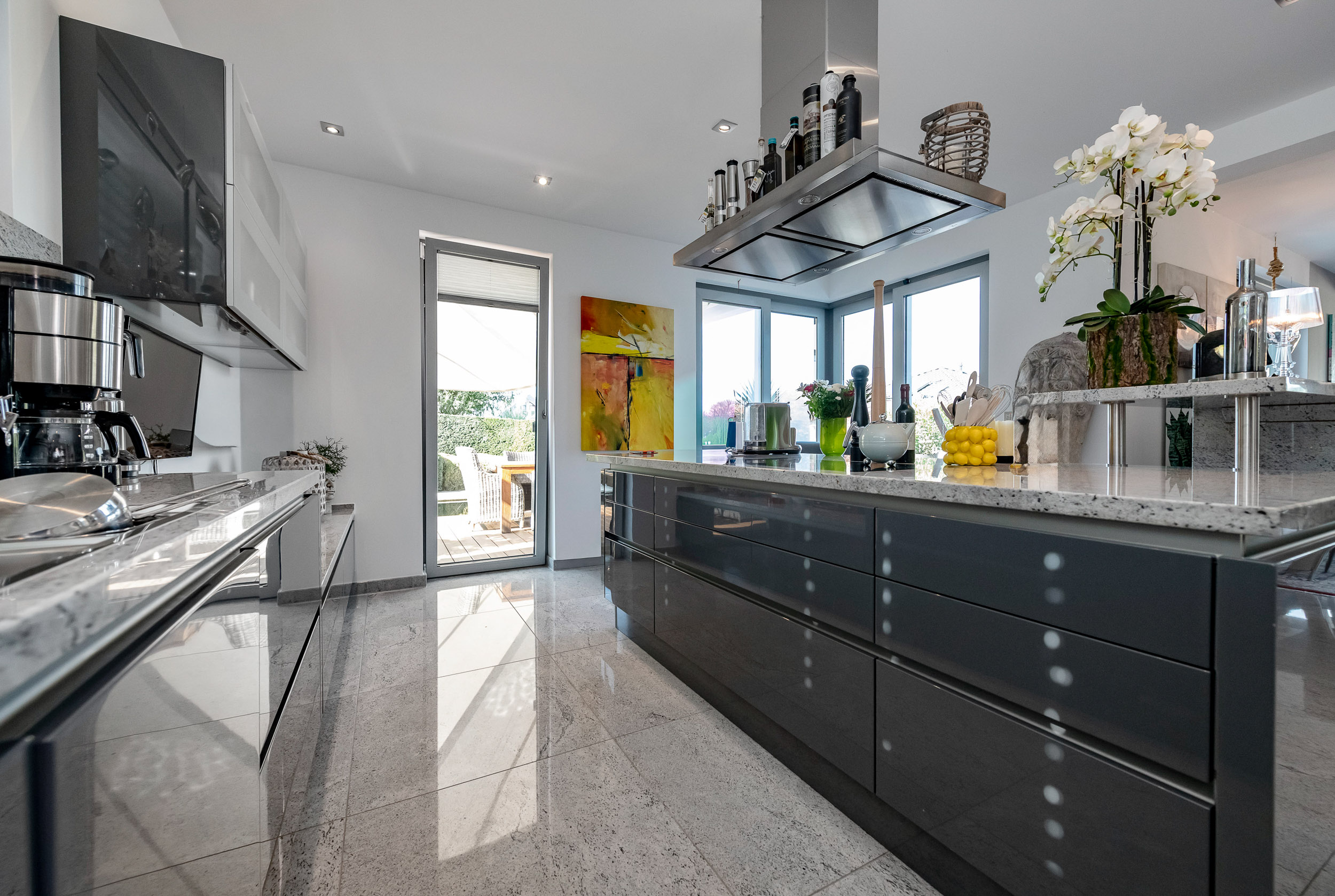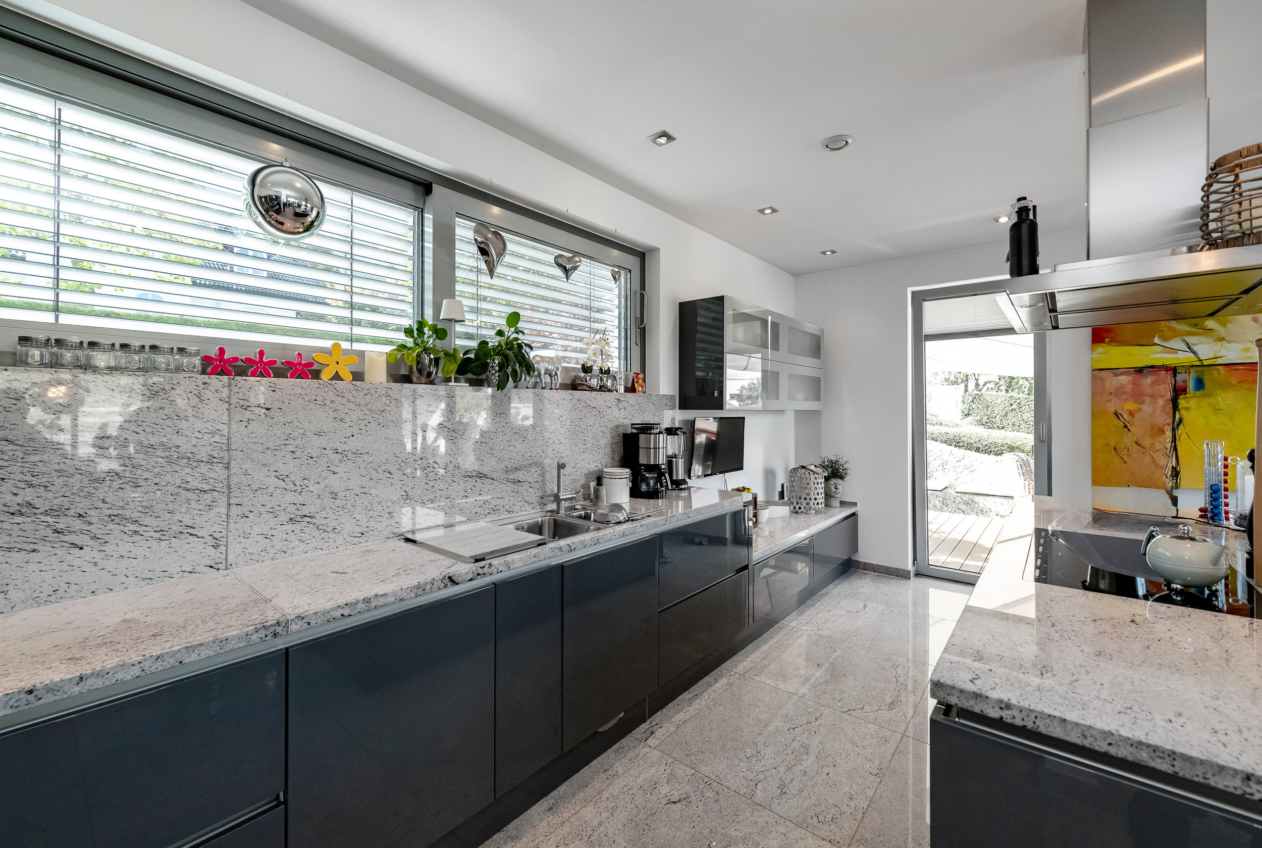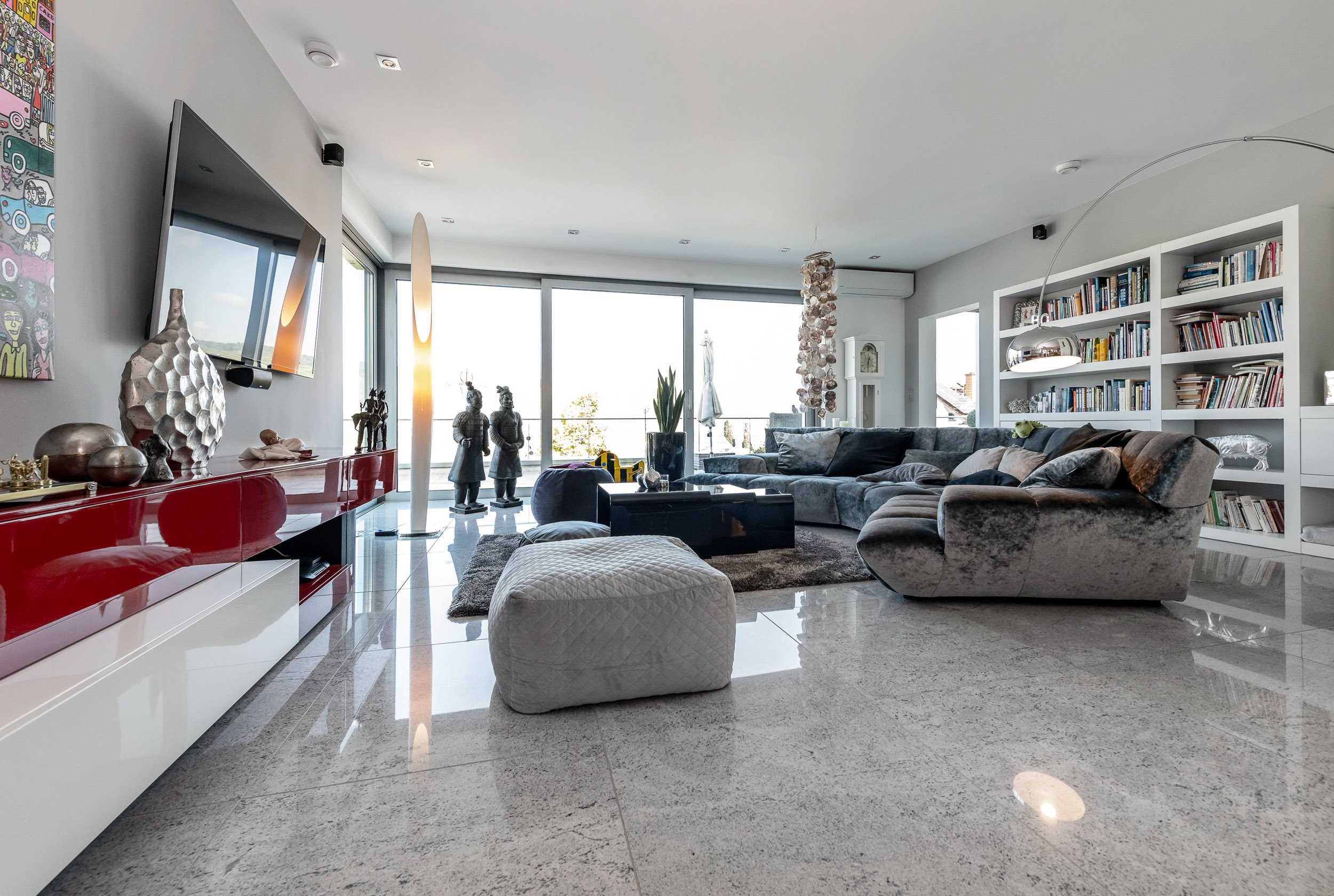 Die moderne, offene Küche mit separater Speisekammer ist ein wahres Paradies für Gourmetliebhaber. Sie ist mit erstklassigen Geräten ausgestattet und lässt keine Wünsche offen. Hier können Sie stilvolle Dinner mit Freunden zelebrieren oder entspannte Familienabende in gemütlichem Ambiente genießen. Der direkte Zugang zur Terrasse ermöglicht es Ihnen, bei jedem Anlass die herrliche Aussicht zu genießen und den Außenbereich in das Geschehen mit einzubeziehen.