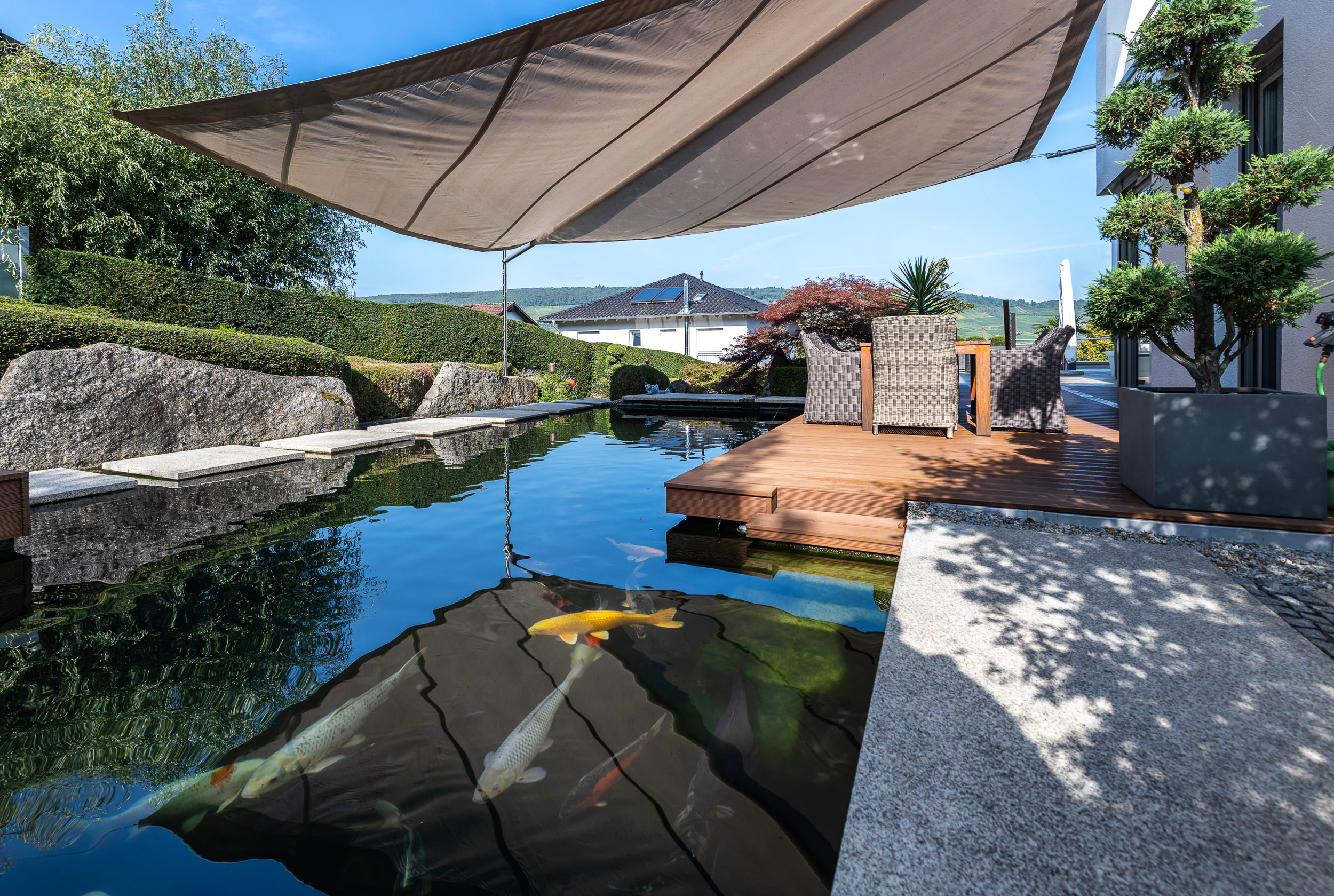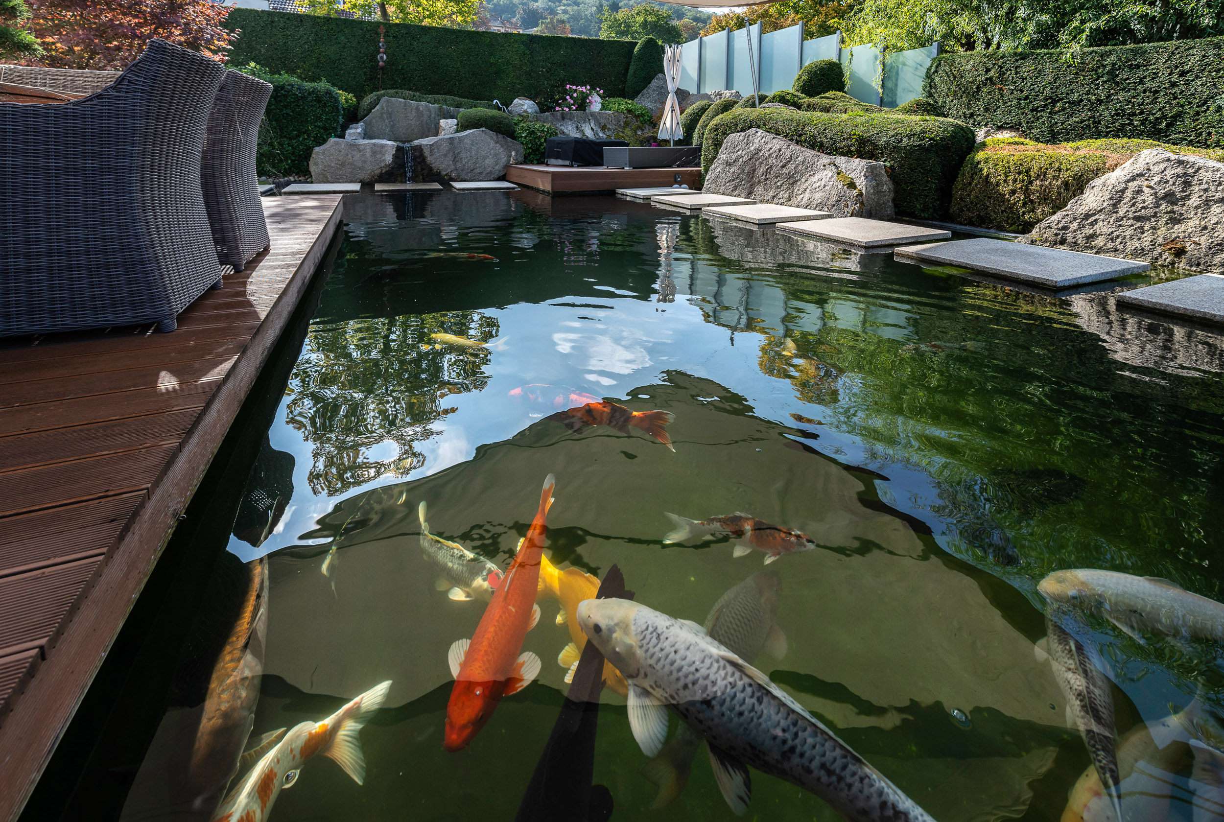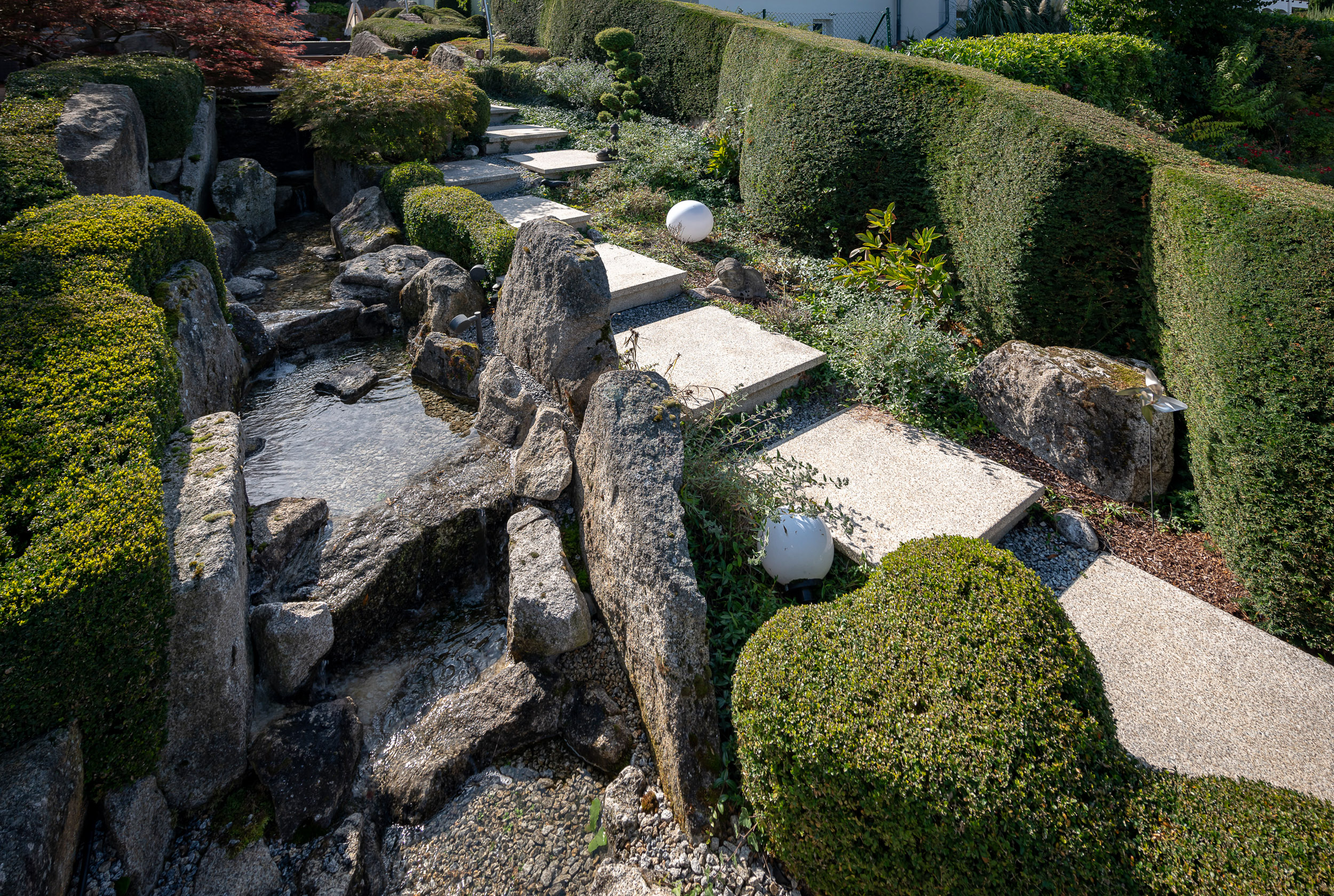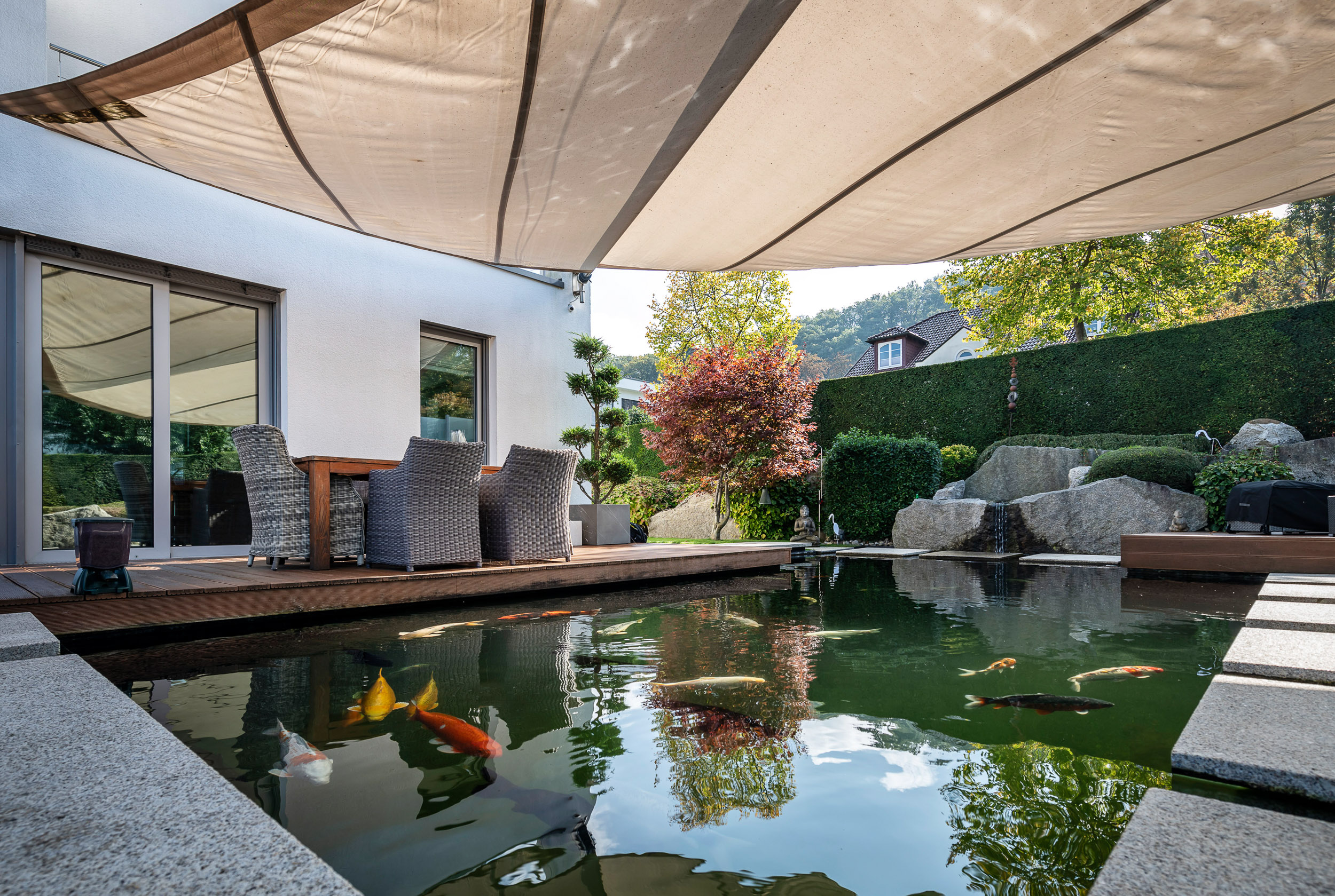 Die aufwendig gestaltete Außenanlage ist ein wahres Refugium der Ruhe und Entspannung. Ein glitzernder Schwimmteich mit Koi-Fischen, ein sanfter Bachlauf, elegante Sitzinseln und passend angelegte Rundwege laden dazu ein, die Natur in ihrer vollen Pracht zu erleben. Diese Außenbereiche sind nicht nur Orte der Erholung, sondern auch perfekte Kulissen für gesellige Zusammenkünfte oder romantische Abende unter dem Sternenhimmel. Ein stilvolles Gäste-WC sowie ein zusätzlicher Raum im Erdgeschoss, ideal nutzbar als Büro oder Bibliothek, runden diese Etage ab.