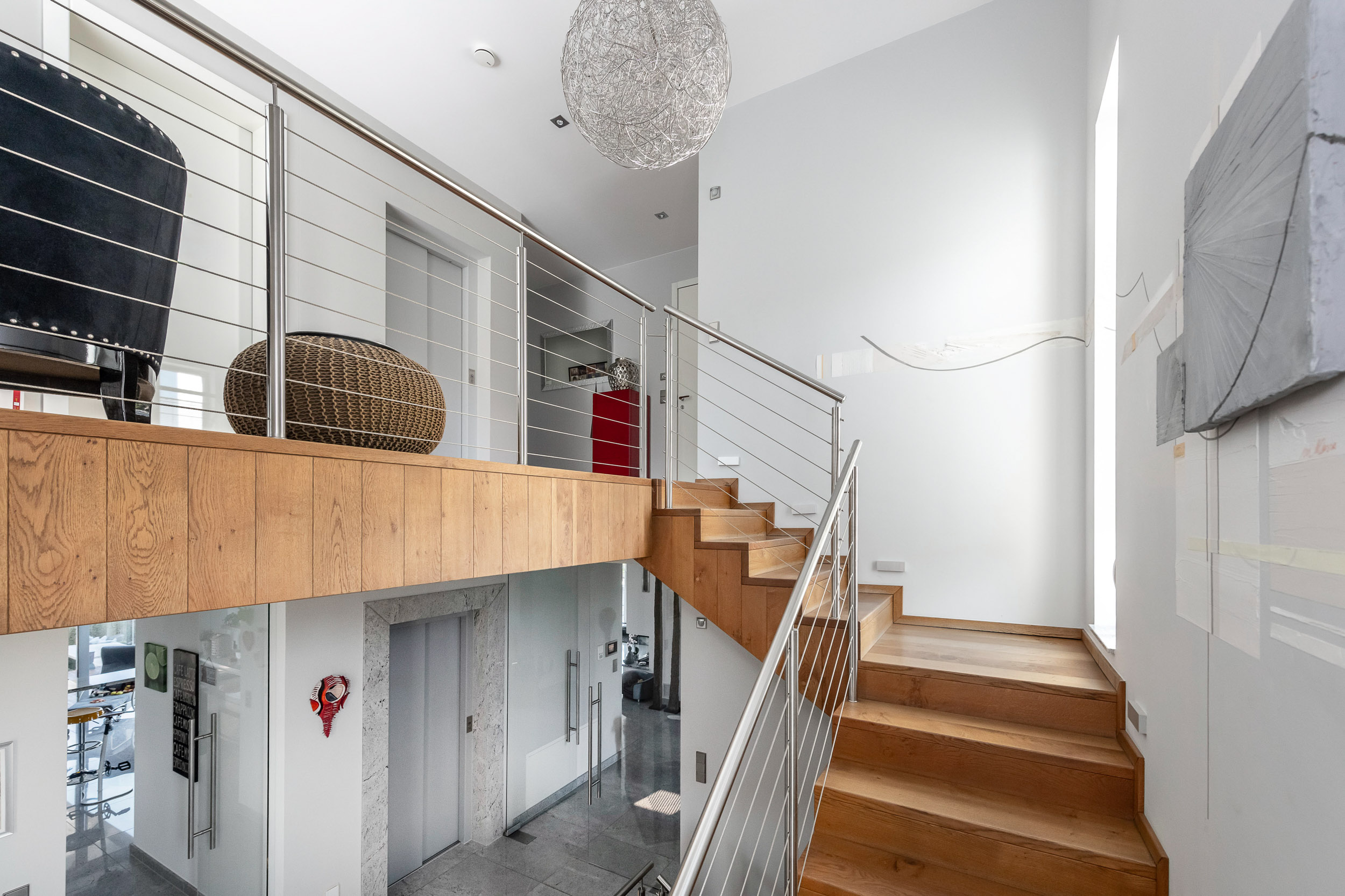 Das Obergeschoss, bequem über einen integrierten Aufzug erreichbar, bietet Ihnen eine luxuriöse Rückzugsoase mit drei großzügigen Schlafzimmern. Der Ankleidebereich und zwei moderne Badezimmer sind ein Traum für jeden, der Wert auf Stil und Funktionalität legt. Das angrenzende Sonnendeck mit Jacuzzi bietet Ihnen nicht nur Entspannung, sondern auch einen atemberaubenden Blick auf den Rhein. Zwei weitere Zimmer, die als Kinder- oder Gästezimmer genutzt werden können, teilen sich ein hochwertiges Badezimmer und verfügen ebenfalls über direkten Zugang zur Dachterrasse oder einen privaten Balkon.