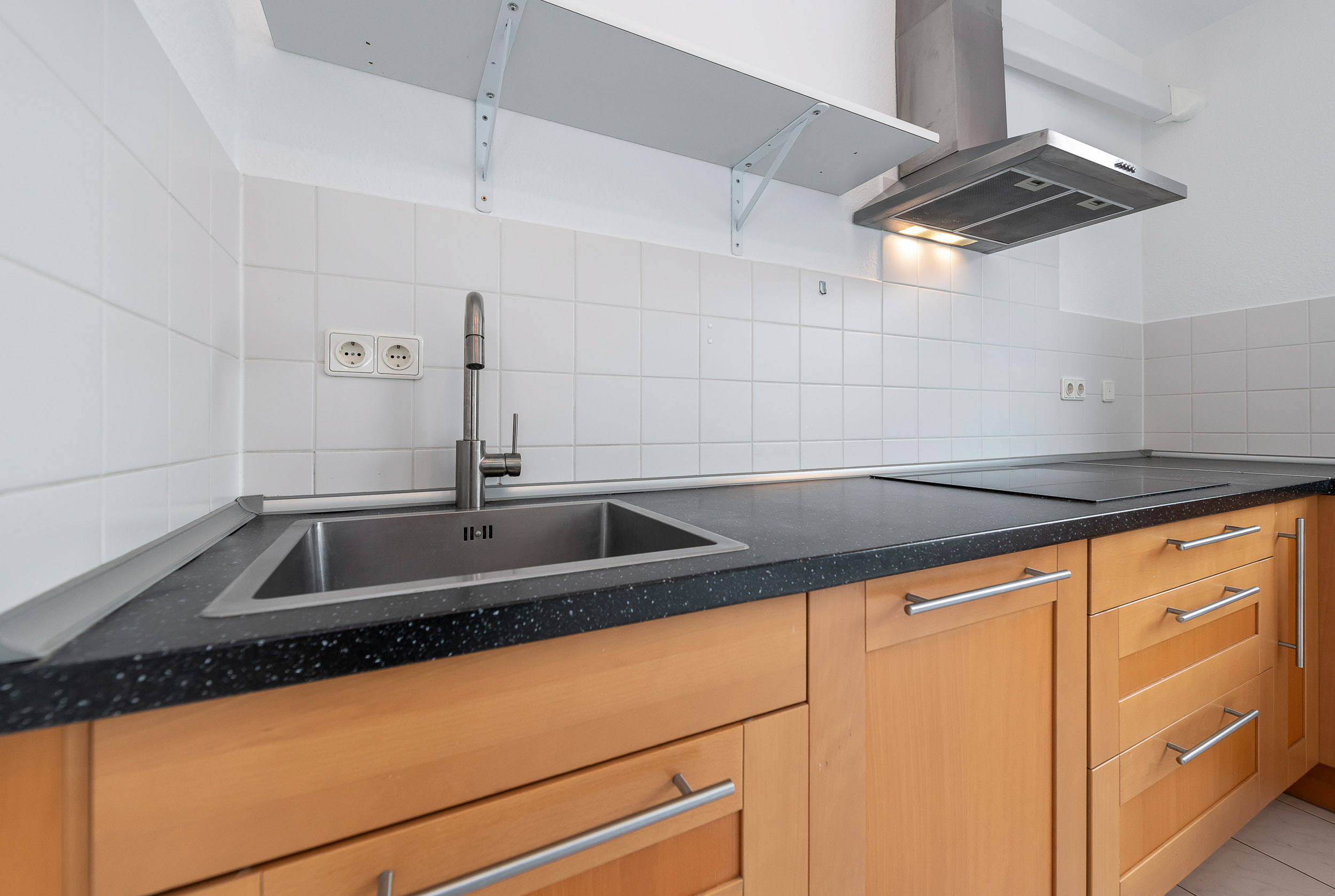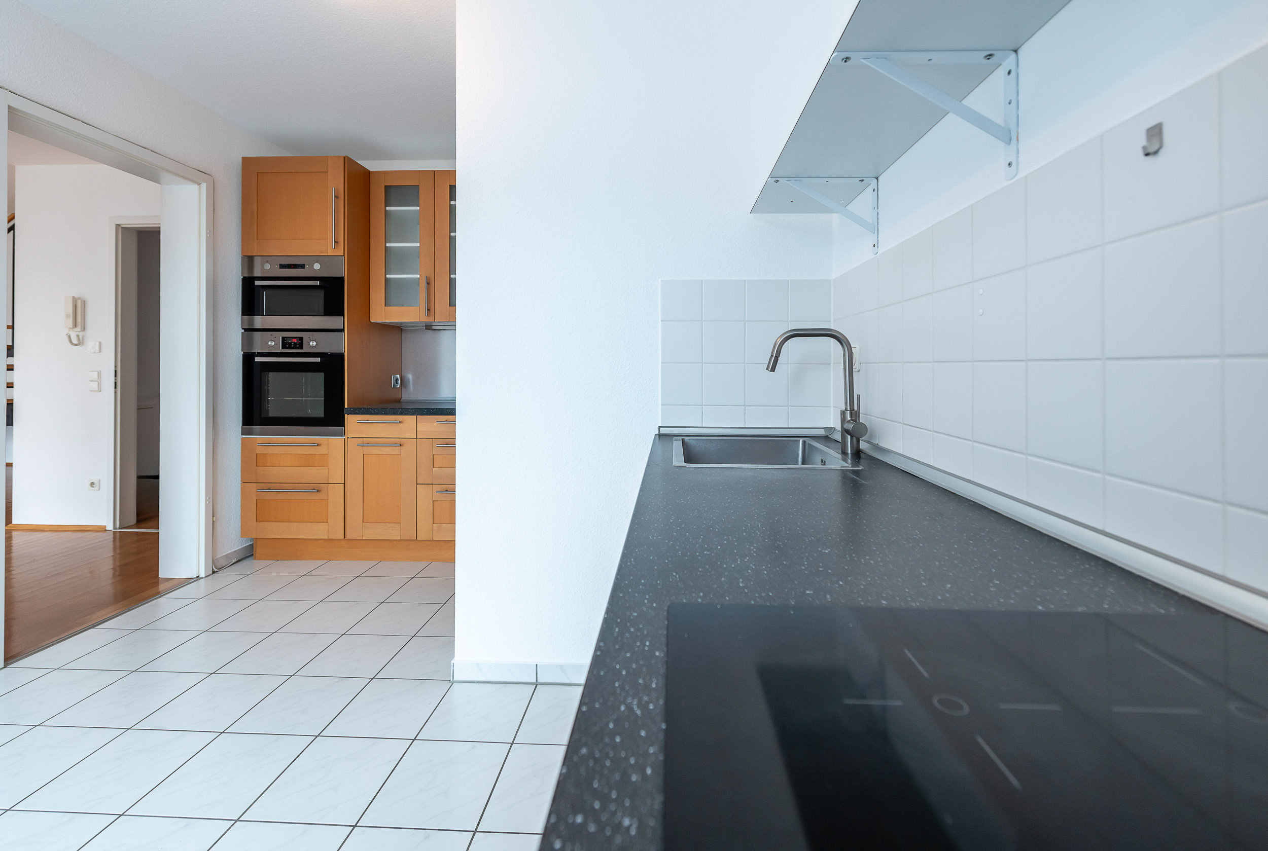 Die vorhandene Einbauküche ist hochwertig ausgestattet und bietet ideale Voraussetzungen für ambitionierte Hobbyköche. Eine angrenzende Speisekammer sorgt für zusätzlichen Stauraum und unterstreicht die durchdachte Raumplanung. Auch von der Küche aus besteht ein direkter Zugang zur Terrasse, was den Wohnkomfort zusätzlich erhöht.