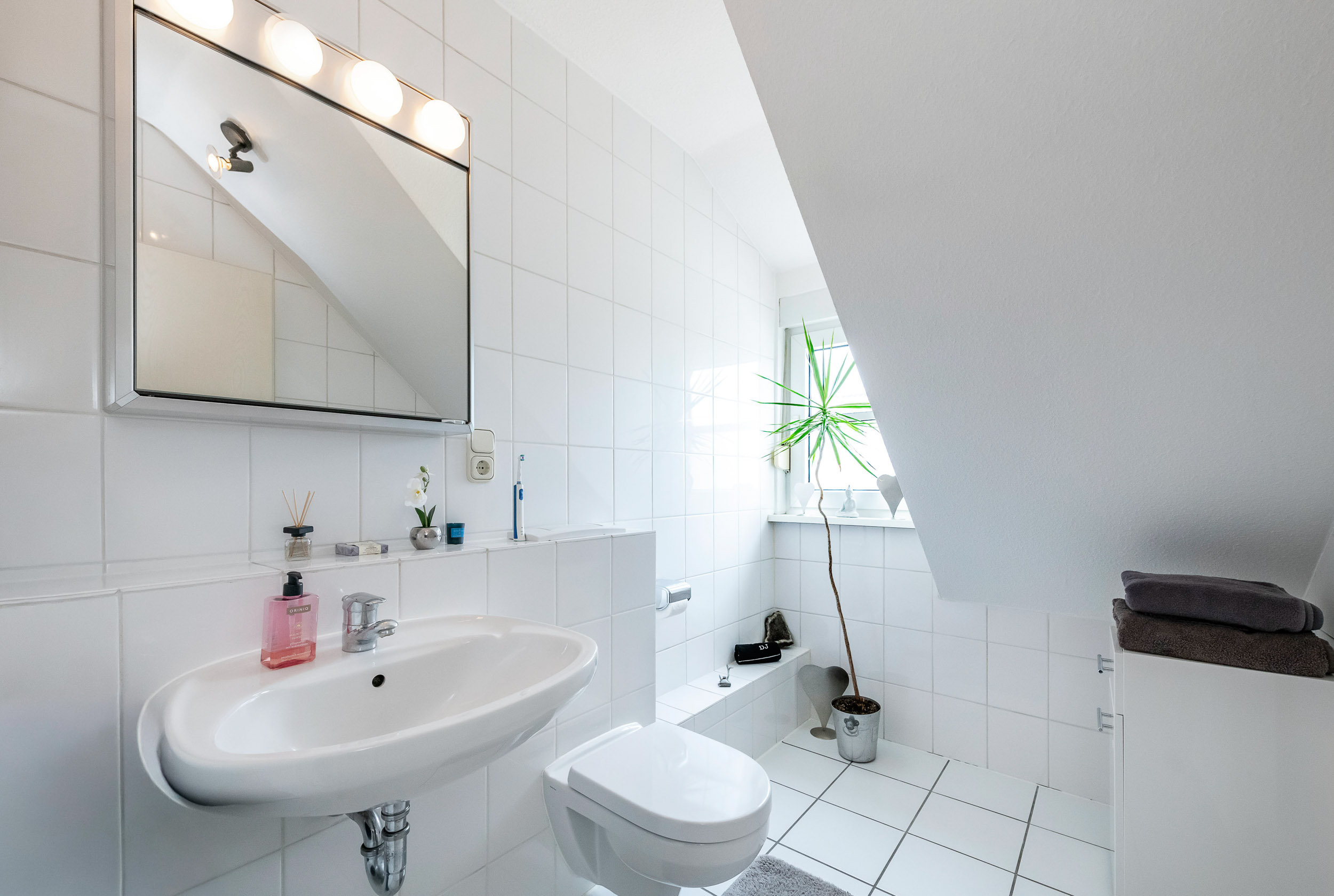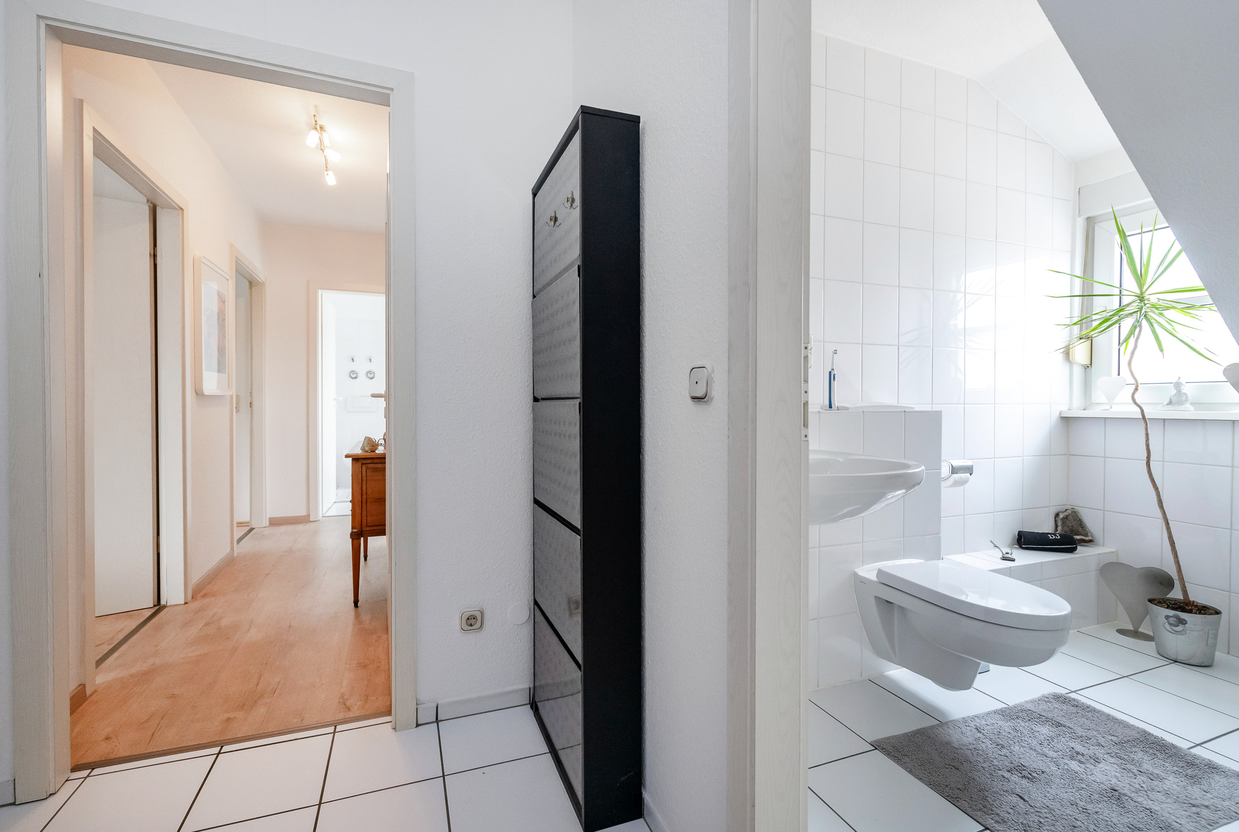 Das Tageslichtbad ist in einem schlichten Weiß gehalten und modern ausgestattet. Es bietet sowohl eine Badewanne als auch eine Dusche, was den Komfort erhöht. Zusätzlich steht ein separates Gäste-WC zur Verfügung.