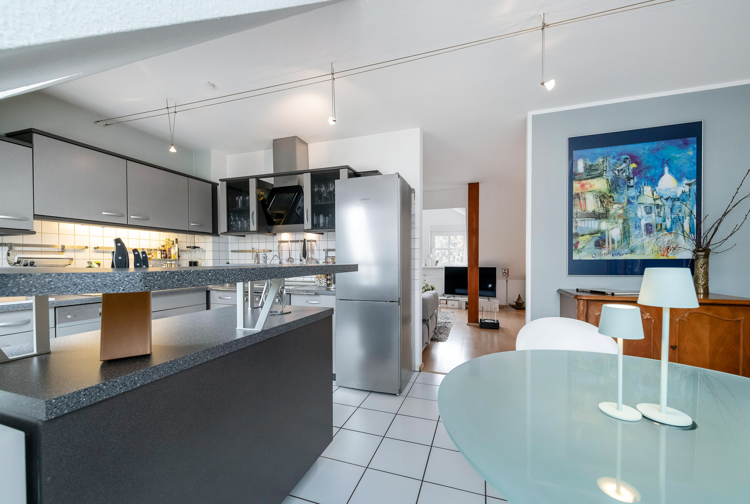 Das Herzstück dieser sonnigen Eigentumswohnung ist der großzügige Wohnbereich, der nahtlos in den offenen Küchen- und Essbereich übergeht. Hier verbindet sich Gemütlichkeit mit modernem Design, ideal für entspannte Abende mit Freunden oder der Familie.